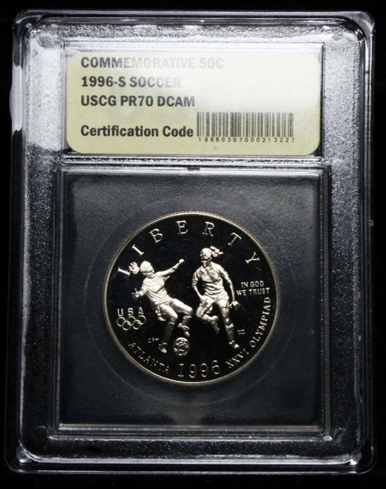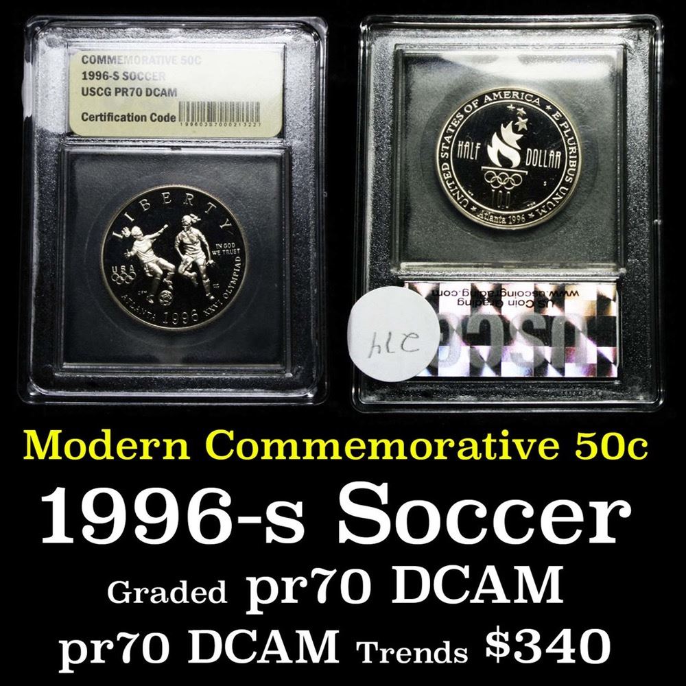 ***Rare 1996-s Olympic Soccer Proof Modern Commem Half Dollar 50c Grades GEM++ Proof Deep Cameo. The 1996 Olympic Soccer Half Dollar was issued as part of an extensive program of commemorative coins for the XXVI Olympiad held in Atlanta, Georgia. There were a total of sixteen different coins issued for the program over the course of two years. This soccer was short produced and is in high demand and more difficult to find. This proof example is graded perfection Gem++ proof Deep cameo by USCG.