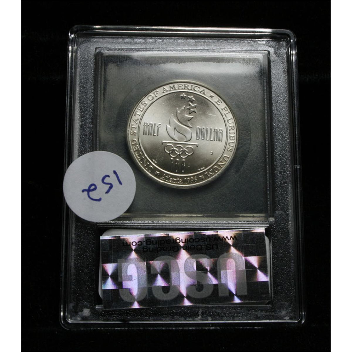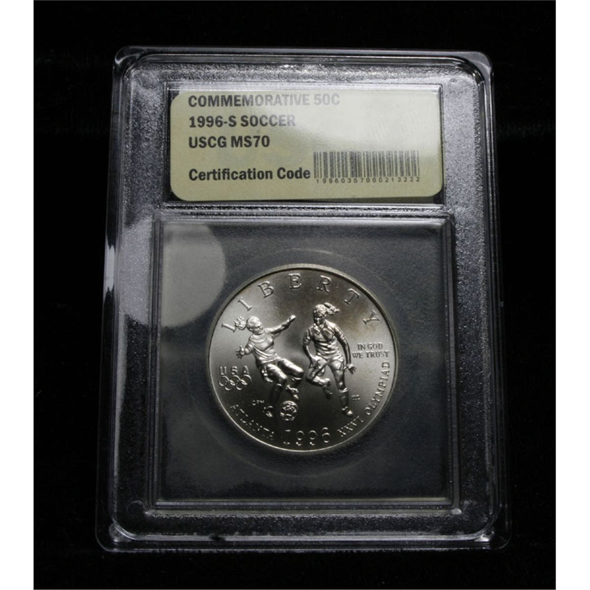 This is one of two KEYS to the Modern Commemorative Half Dollar Series. Very hard to locate and very highly priced. The 1996 Olympic Soccer Half Dollar was issued was part of an extensive program of commemorative coins for the XXVI Olympiad held in Atlanta, Georgia. There were a total of sixteen different coins issued for the program over the course of two years. PCGS lists ms70 as $650. This Perfect coin is graded ms70 by USCG. Estimated Value $350.