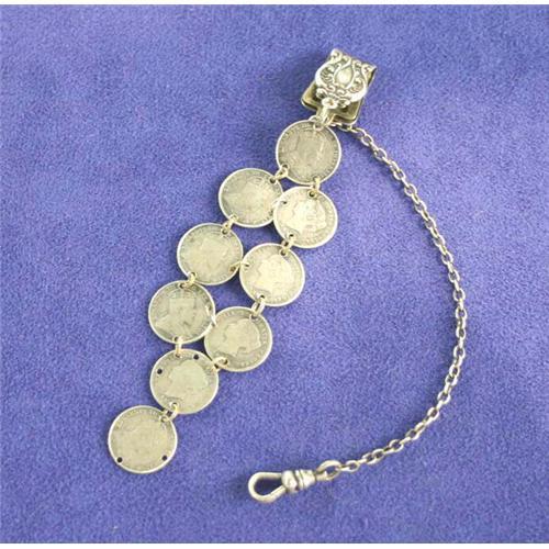 A rare piece of French Canadian history! A beautiful Sterling Silver Victorian/Edwardian Period Watch Fob Decorative clip holding a 5 ½ inch chain suspended with 5 King Edward VII five cent silver coins and 4 Queen Victoria, five cent silver coins. Detailing on all is exceptional with the exception of one Queen Victoria coin has considerable ware on the back. The King Edward VII coins are marked with his profile on the front surrounded by Edward VS VII D G Rex Imperator, the backs are marked with trailing foliage, a crown at the top and 5 cent Canada, dating from 1902, 1903, 1905, 1906 and 1907. The Queen Victoria coins are marked with her profile on the front, Victoria Dei Gratia Regina and the back of the coins are marked with a crown at the top, trailing foliage and 5 cents, two coins are from 1898 and one coin is from 1896. The one coin mentioned previously with considerable ware to the back is illegible.