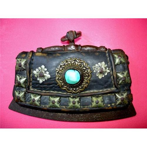 ntique 19c Tibetan tooled leather purse decorated with a large turquoise stone mounted in the center surrounded by repousse silver and brass in high relief. Authentic decorated purses like this one are very difficult to find, especially in this fine condition.