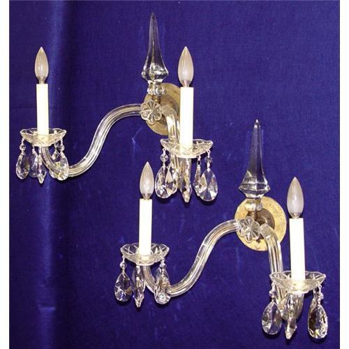 Nice pair of electrified 19th century Victorian crystal 2 arm sconces with large tear drop crystals and centered with a fine larger vertical pyramidal crystal and horizontal flower form crystal. Wired for standard smaller socket 25-40 watt bulbs.