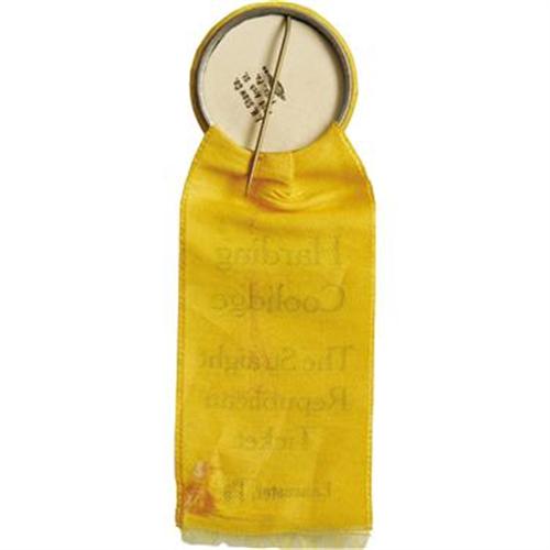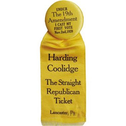 <B>Rare 19th Amendment Republican Badge</B></I> This historical item is a memento from the very early days of female suffrage. It consists of a pinback button covered in gold fabric affixed to a gold ribbon. The button reads, "Under the 19th Amendment I Cast My First Vote Nov. 2nd, 1920". The ribbon below reads, "Harding Coolidge The Straight Republican Ticket Lancaster, Pa." Very light stains on the ribbon with the some doubling of the location's type. Else, very fine condition.