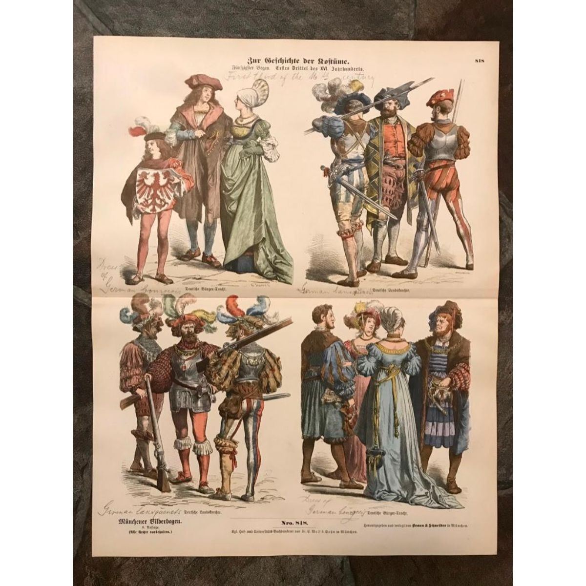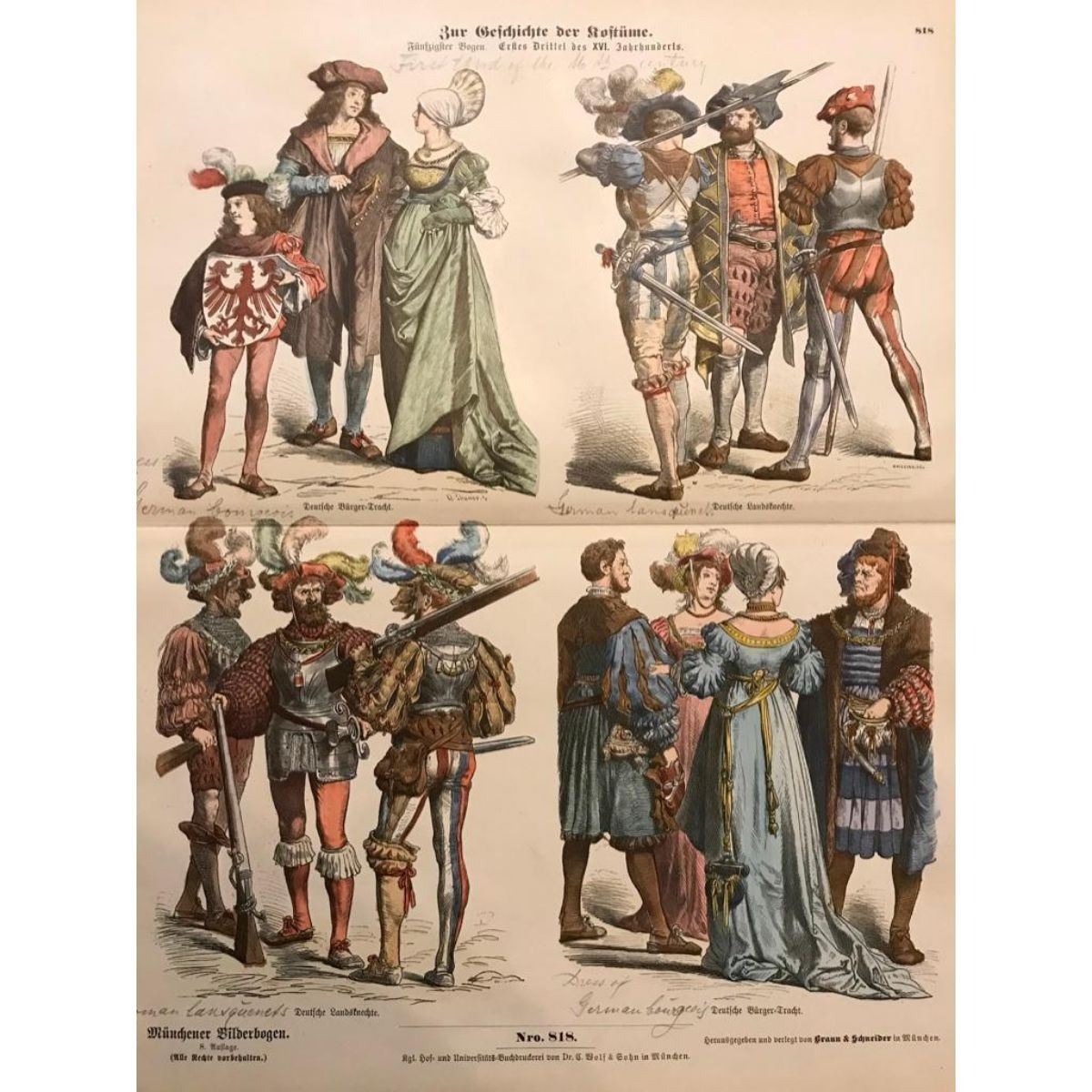 Rare 19th Century costume plates, double-page book plate, hand-colored engravings from a German book, "Zur Geschichte Der Costume". Depicts German bourgeoise & lansquenets. 13 1/4" X 17". * handwriting in pencil with several illustrations to translate the German to English.