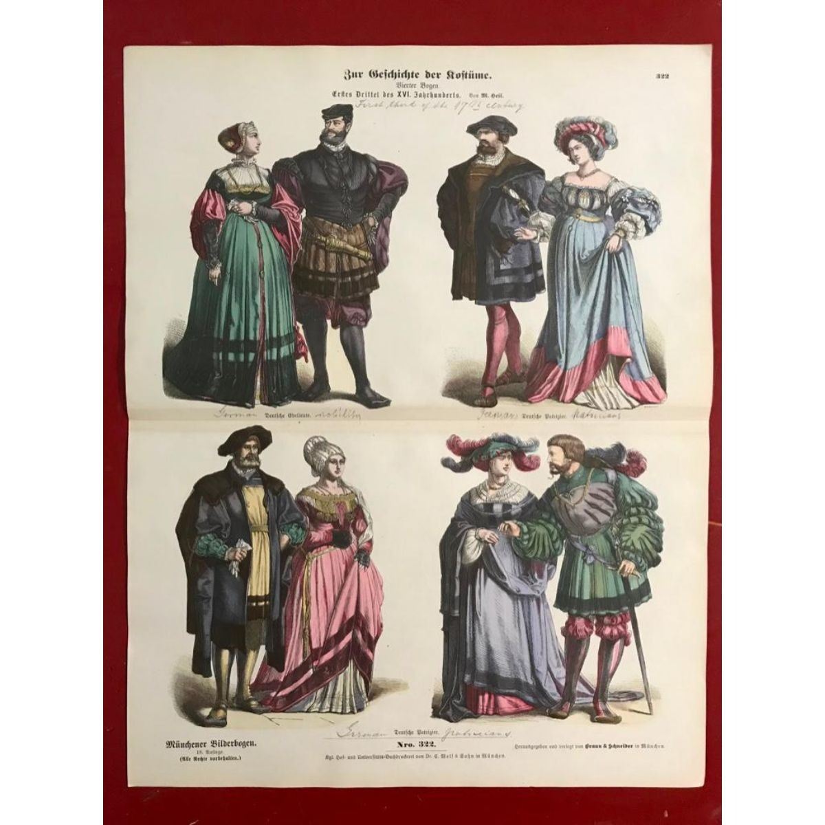 Rare 19th Century German costume plates, double-page book plate, hand-colored engravings from "Zur Geschichte Der Costume". Depicts the First Third of the 17th Century, German Nobility & Patricians. 13 1/4" X 17". * handwriting in pencil underneath each illustration to translate German to English.