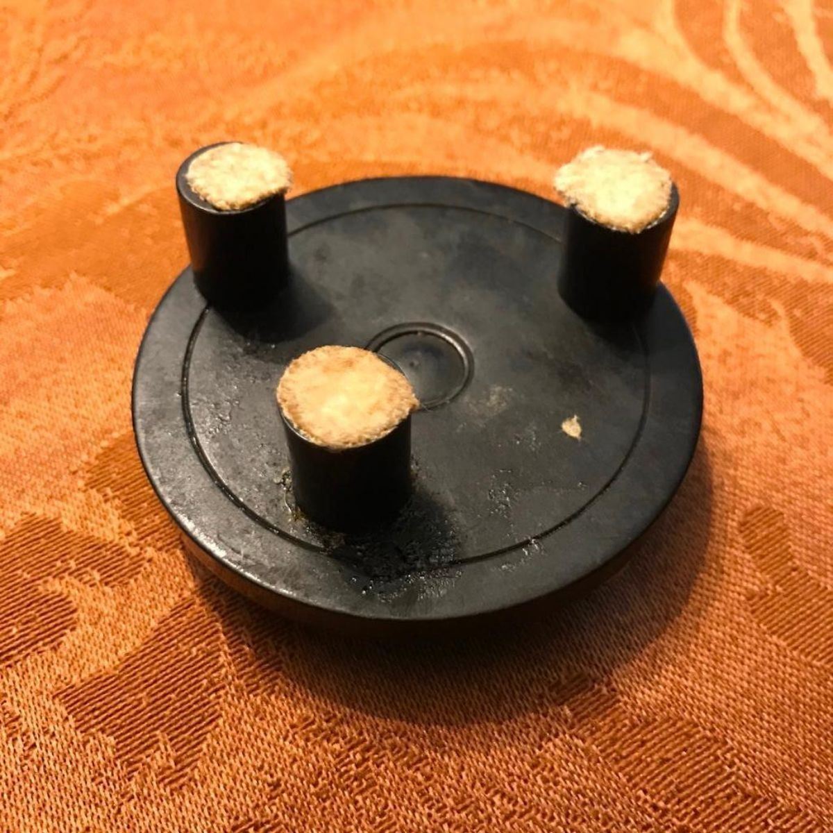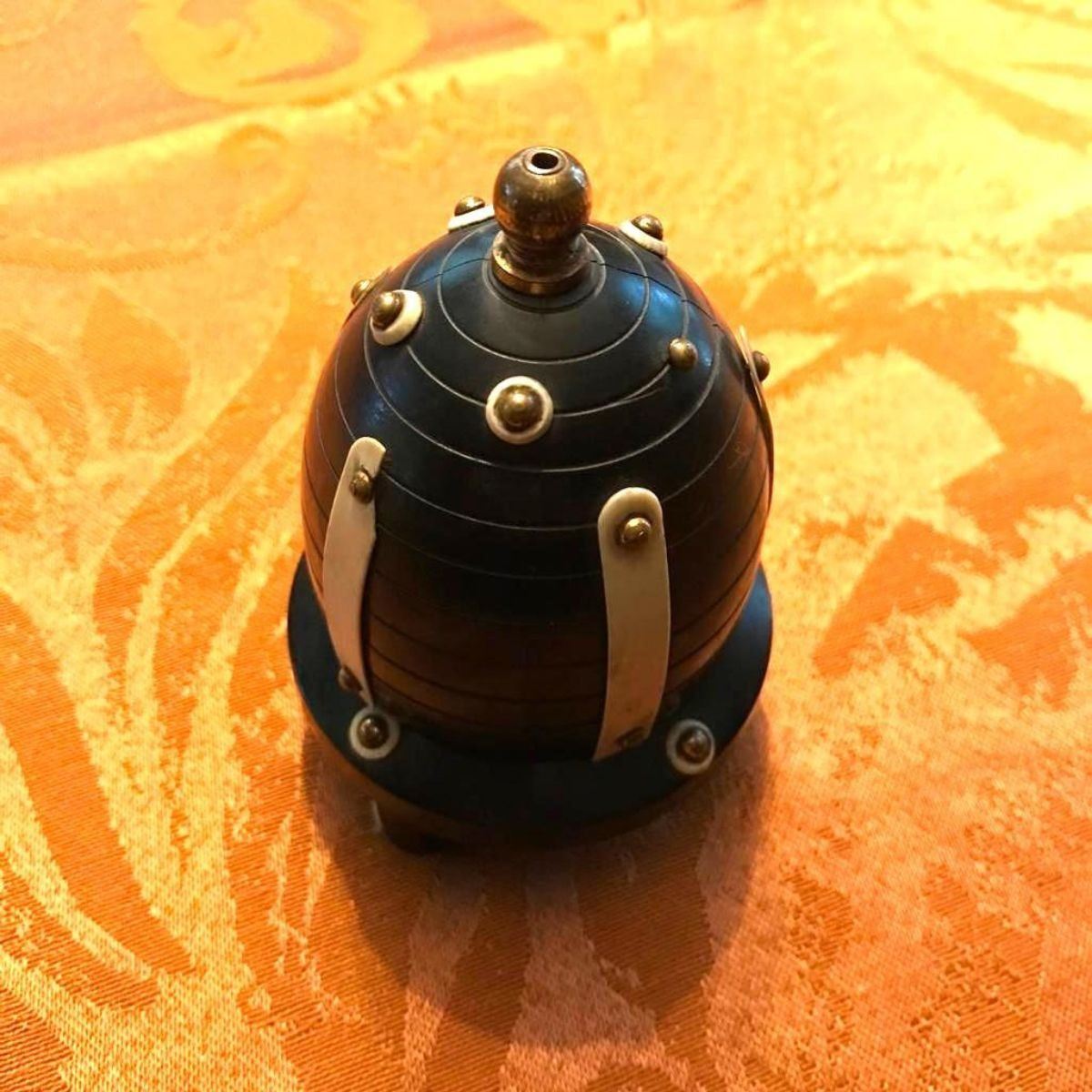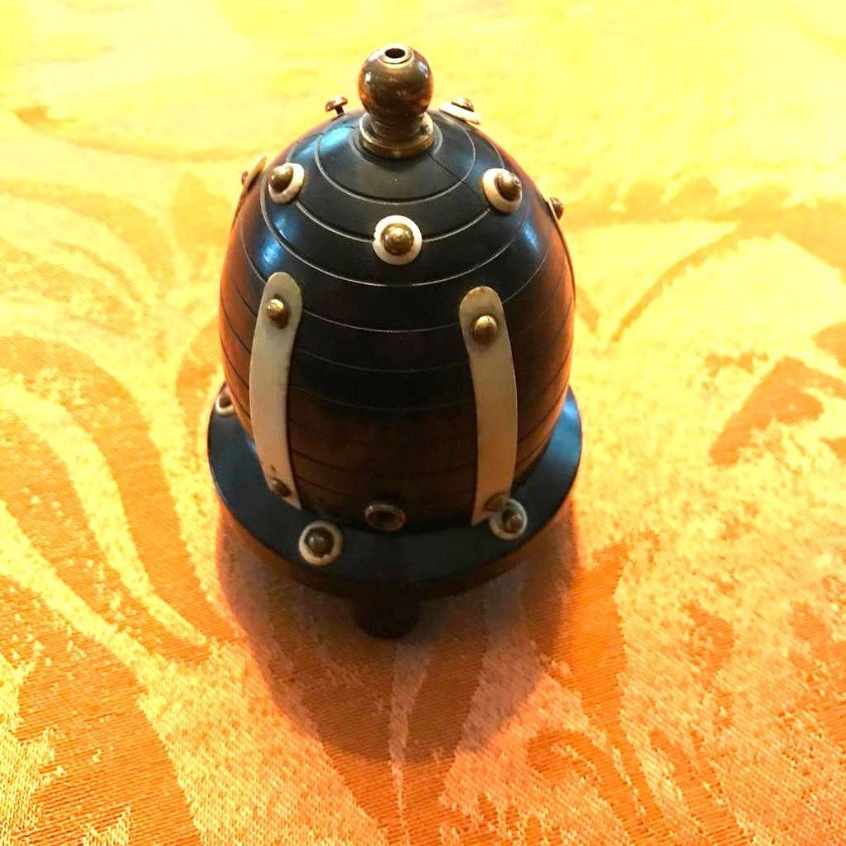 Rare & unusual 19th Century H. Stock Folkstone parlor trinket, netsuke, ojime display dome with stand. Guetta percha "bee skeep" style dome, with ivory strips & brass pin decoration. Interior of dome top lined in brass, with original store stamp " From H Stock, Fancy Repository, High Str. Folkstone". Identical stamp on top of stand, with 3 round peg legs, one appears to have been repaired in the past, a small crack to the top, missing a round ivory decoration around brass pin & slight loss to the top of one of the ivory strips. Brass top knob. Case used possibly for an ivory netsuke or tiny ojime statue. 4" H X 3 5/8" D. From an estate in New Orleans.