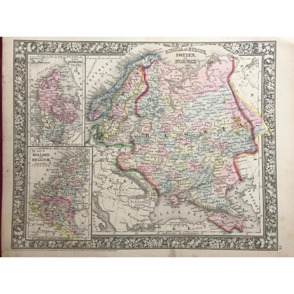 Rare 19th Century map of "Russia in Europe, Sweden and Norway" from New General Atlas published by S Augustus Mitchell Jr in Pennsylvania, 1860. Two insets show Denmark, and Holland and Belgium. Original hand colored outline and washes accentuate countries on this very attractive map. Image is surrounded by a lovely twining leaf and flower border. Faint age toning. Image measures 10 3/4"x 13 5/8". Overall size 12" X 15". Â
