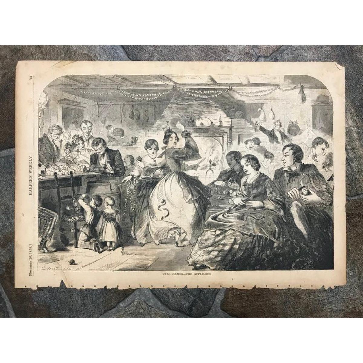 Rare 19th Century wood cut engraving, from a November 1859 edition of Harper's Weekly Illustrated. Fall Games - The Apple-Bee. 10" X 15" in packaging from The American Heritage Gallery