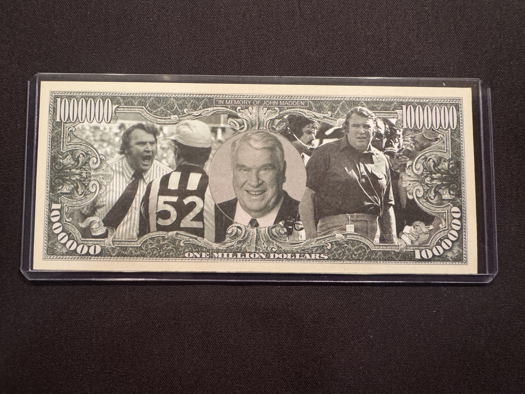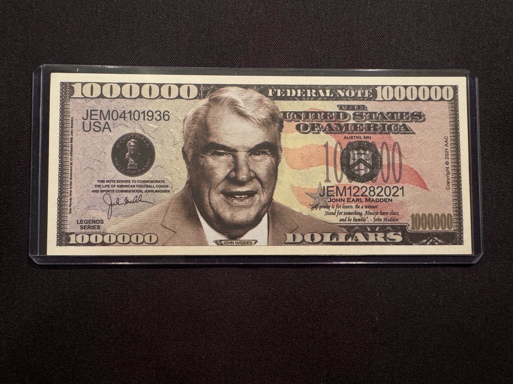 Rare 2021 John Madden Football One Million Dollar Bill - Mint In Protective Holder