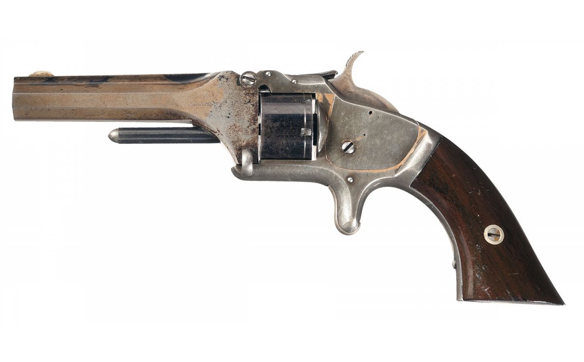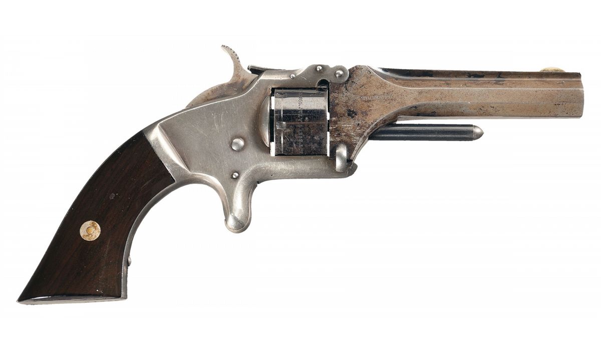 Condition: Very fine, 25% of the original blue finish remains on the cylinder, cylinder stop and cylinder pin with a smooth brown patina on the barrel. The frame retains 95% of the original silver plated finish with some flaking around the left side plate which has two small holes. The grips are also very fine with some scattered minor dings and scratches, concentrated mostly on the left panel. 2nd quality revolvers are often faked, and this is a true example of a rare Smith & Wesson 1st Model 2nd Issue.