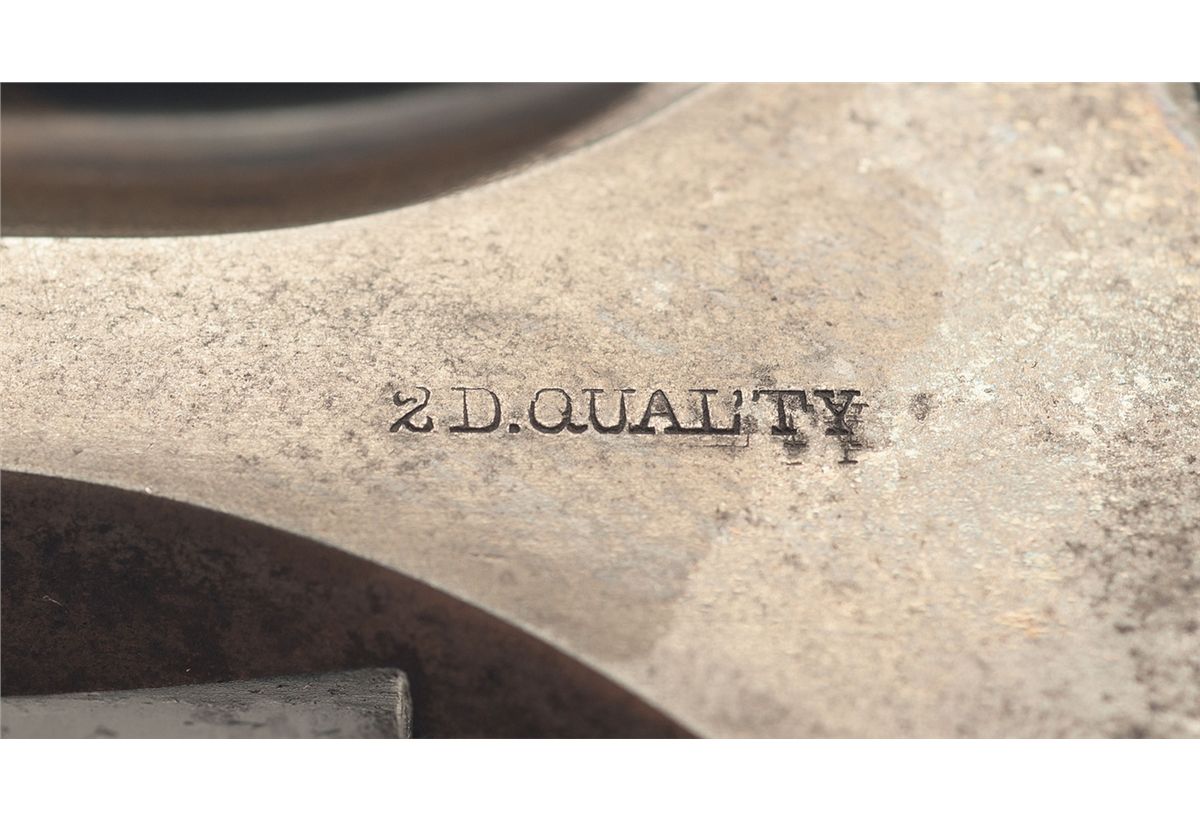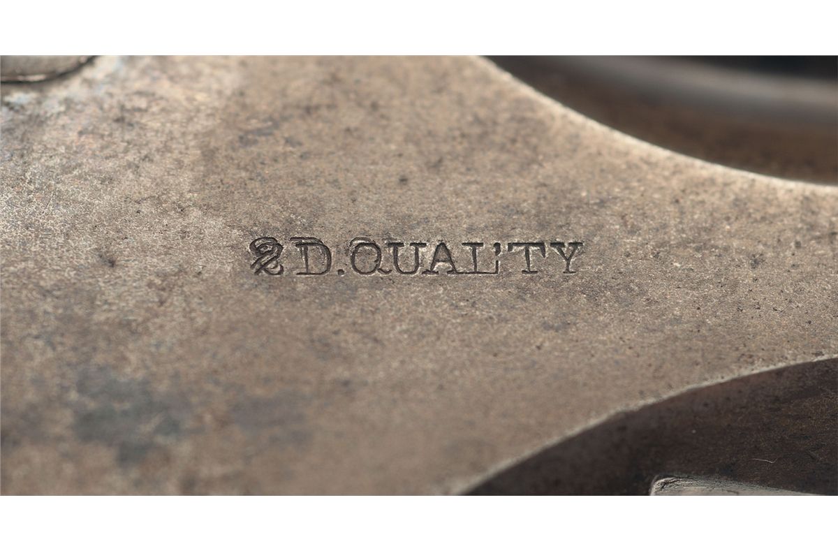 There were 117,000 of these revolvers manufactured between 1860 and 1868 with a only about 4,402 marked "2D. QUALITY" which were sold at a discount due to a minor casting flaw. German silver blade front sight and a notch rear sight in the cylinder stop. The frame is silver plated and the barrel and cylinder are blued along with the cylinder stop and cylinder pin. The frame on the right side under the grips is stamped "2C". Fitted with a set of smooth rosewood grips with the matching serial number stamped on the inside of the right panel.