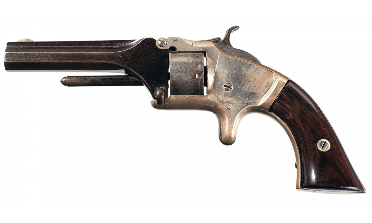 Condition: Fine. The barrel and cylinder retain scattered traces of original blue finish with the balance a smooth brown patina. The frame retains 30% period replated silver finish with the exposed brass having an attractive patina and scattered overall pin prick pitting. The refinished grips are very good with a repaired chip and a few minor handling marks. Mechanically fine.
