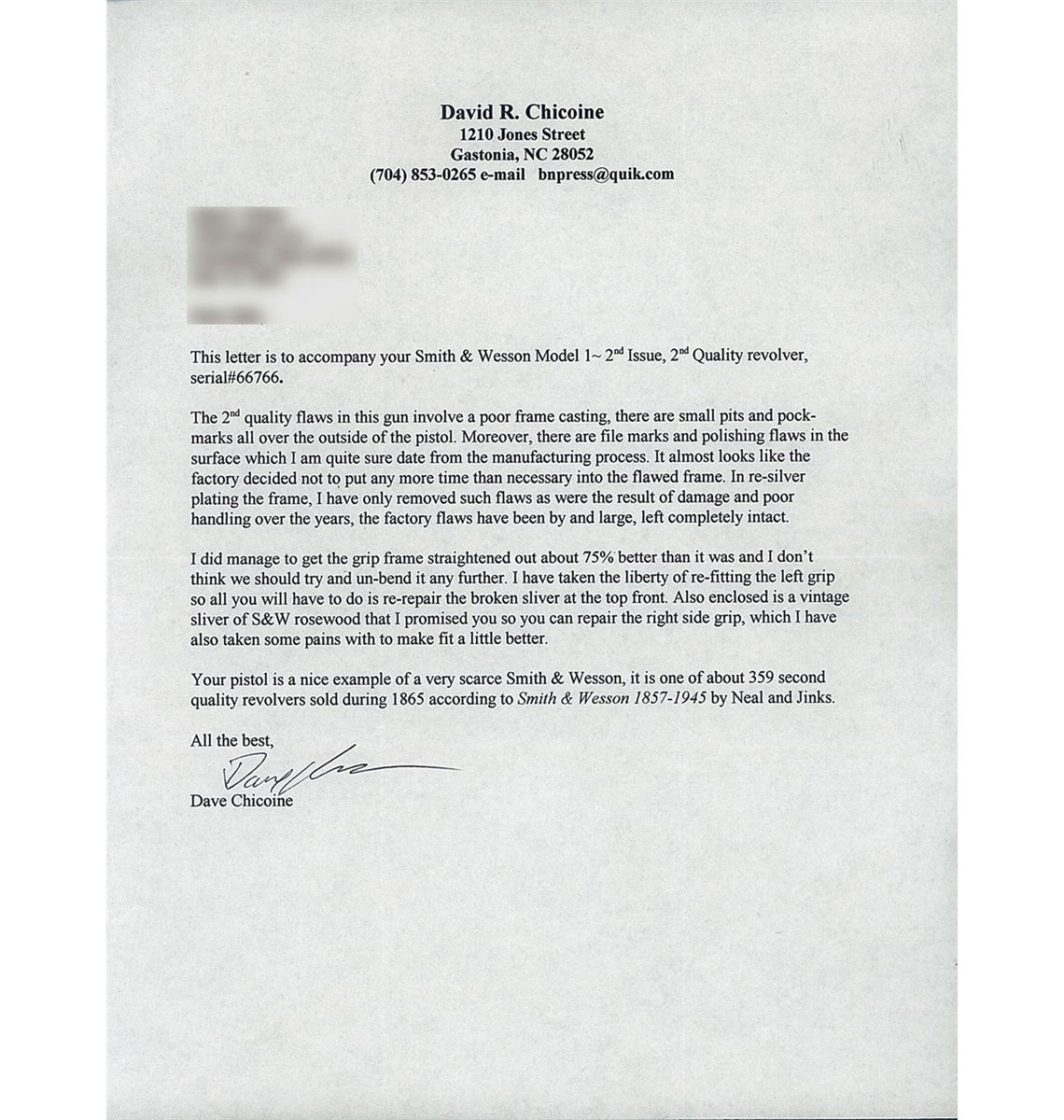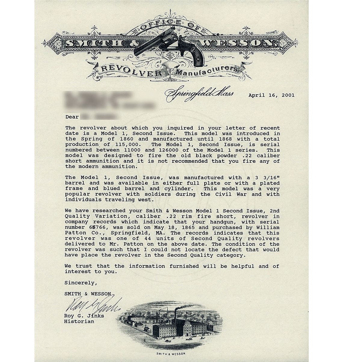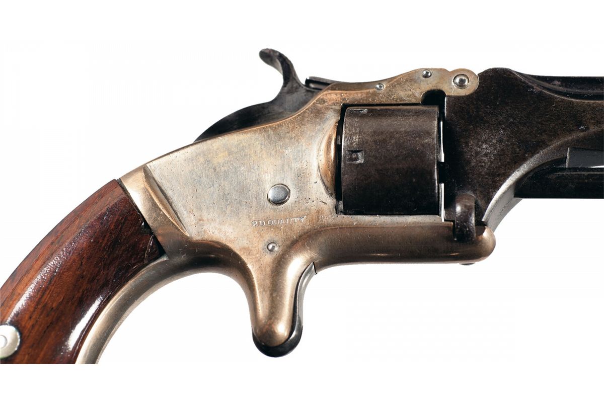 Manufactured circa 1860 to 1868, this is an example of one of the approximately 4,400 2nd Issue revolvers that were marked "2D. QUALITY" due to a slight casting flaw during manufacture. This revolver is marked "2D QUALITY" on the right side of the frame. The top of the barrel is marked with the one line address and patent date on cylinder. Serial number on butt has been double stamped, likely by the factory. The factory letter confirms the serial number and 2nd quality marking. The revolver was sold on May 18, 1865 and purchased by William Patton Co., Springfield, Massachusetts, as part of a shipment 44 2nd quality revolvers.
