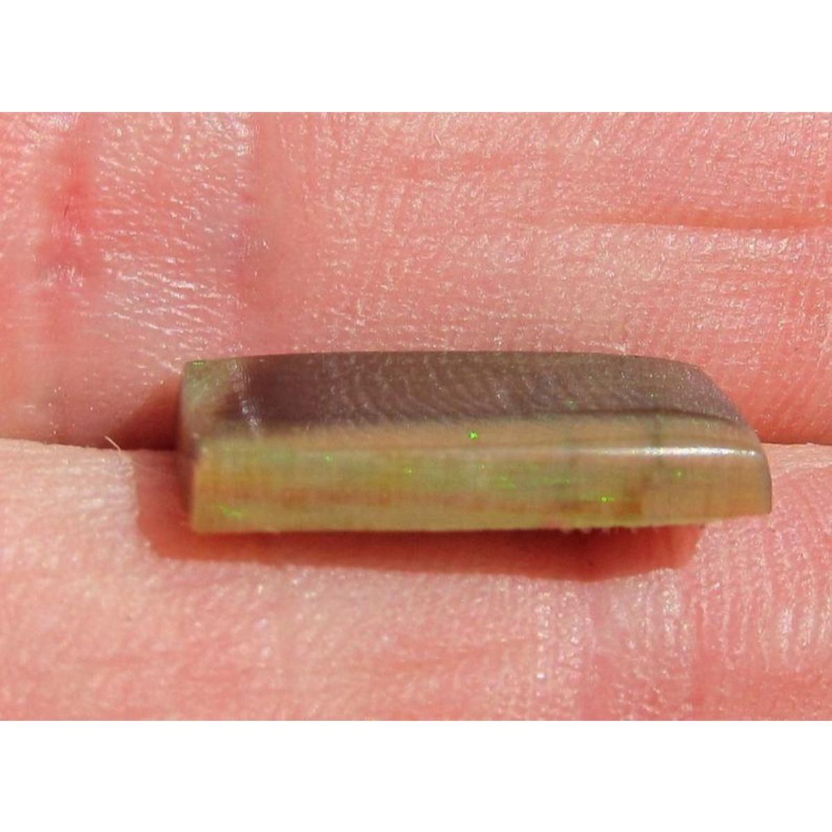 3.2ct rare Virgin Valley Nevada Wood Opal. Beautiful natural woodland colors, with laser pinfire in bright light. Appx. size: 17 x 8.5 mm - 2 mm thick. Nice stone for mounting into a pendant. * Virgin Valley Nevada Opal material is almost all wood that has been replaced by opal. Most contain a high percentage of water in their structure, & they often crack or craze when dried, making this kind of opal quite rare in dry stable form. * This stone has been stabilized with resin to strengthen the wood, but the resin does not affect the opal. Â