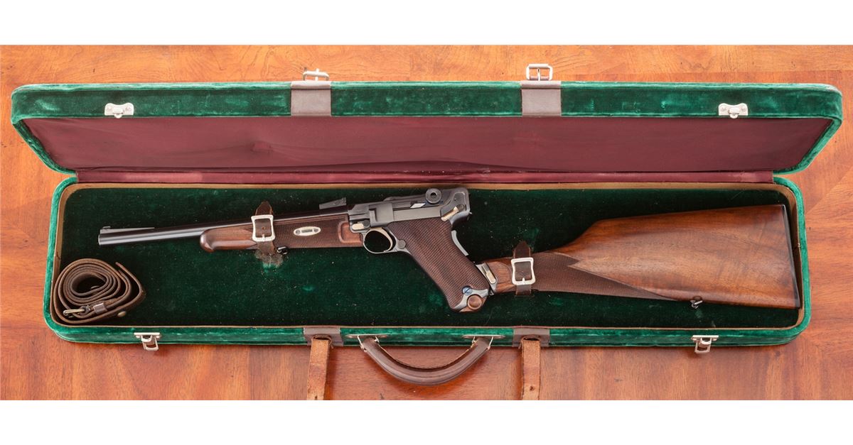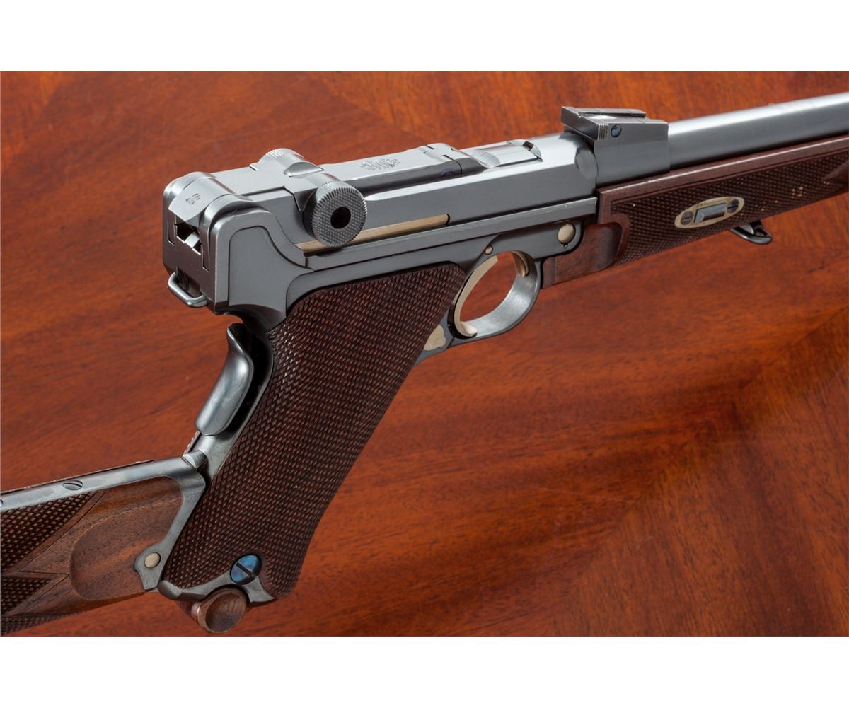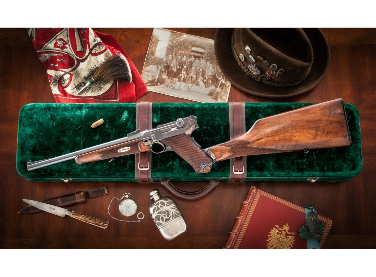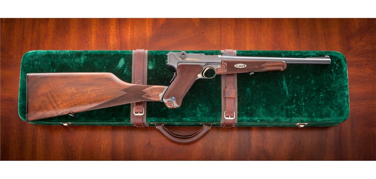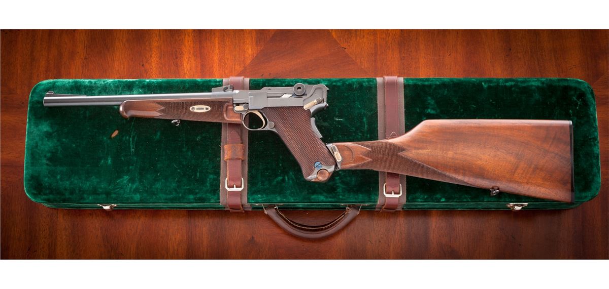Rare Possibly One-of-a-Kind .45 Cal. Model of 1906 ''GL'' Luger Carbine, #21, .45 cal., 11-1/2'' barrel, blue finish with straw small parts, checkered walnut grips and forend, as well as checkered detachable buttstock with matching numbered attaching iron. The late Ralph Shattuck stated that he purchased this gun in 1982 and it remained in his personal collection for over 25 years, before being acquired by our consignor. Mr. Shattuck further stated that this Carbine was purchased from the Ronald Morton estate in Troy, MT. Mr. Morton's half-brother, Kenneth Morton, was named after his relative Major Kenneth Morton, who was involved in the early 1900s weapons test trials. The grip angle remains the same as the earliest test Lugers. Carbine additionally features grip safety, round knurled toggle knobs, serrated thumb safety with lower portion polished bright, extractor marked ''Loaded'', with unique stock lug and attaching iron, which features an additional lower prong for added stability when firing its larger caliber. This Carbine differs from the military .45 ACP Test Lugers in that it is chambered for .45 F.A. 4-06 round, which is one millimeter longer than .45 ACP. Chamber area is blank, oversized DWM markings to central toggle link, with ''GL'' monogram to back edge of rear toggle link; three-position Carbine style sight with ramp and silver bead front sight. Carbine also includes a period sling and one round of .45-06 ammunition. Complete in period emerald green velvet case with leather straps and nickel hardware. This exact firearm was listed on Mr. Shattuck's website ''World of Lugers'' and priced at $1,000,000 as late as 2008. As the DWM factory has suffered mergers, reorganizations and two World Wars, there is currently no documentation linking this firearm to DWM. If in fact this documentation were to surface, this particular firearm would easily be worth $450,000-$600,000. Condition to Carbine is excellent with light wear in actioning areas. Checkering remains mostly sharp, however, the grip panels themselves show minor flattening and are of a coarser variety than those found on the 1907 Test Lugers. Action remains crisp, bore is bright, fire blue screws show light wear. Case remains in fine condition with one small abrasion to left portion of lid, with either added or replaced leather strapping; interior with impressions and soiling from pistol and some residual glue from repair to forward strap. Est.: $150,000-$300,000.