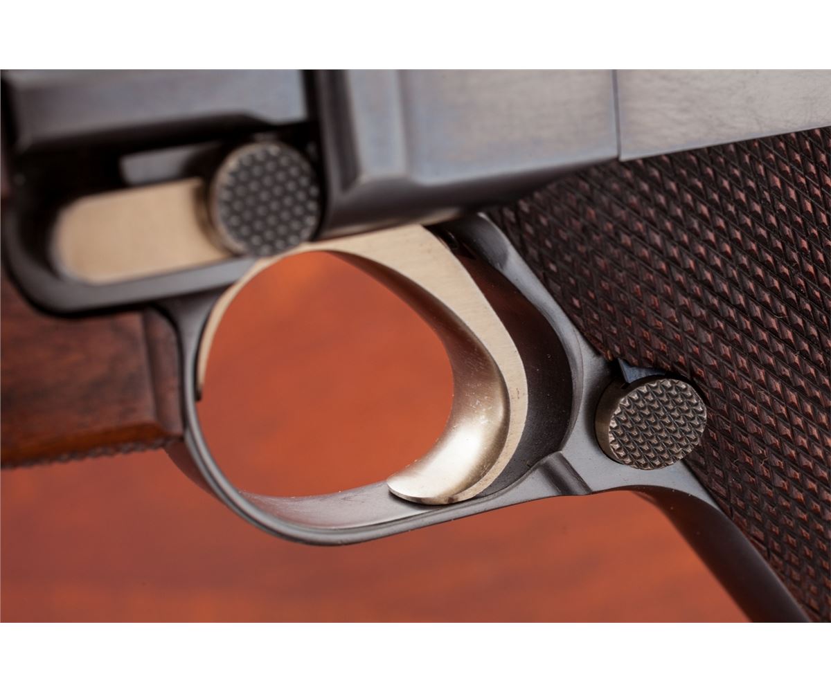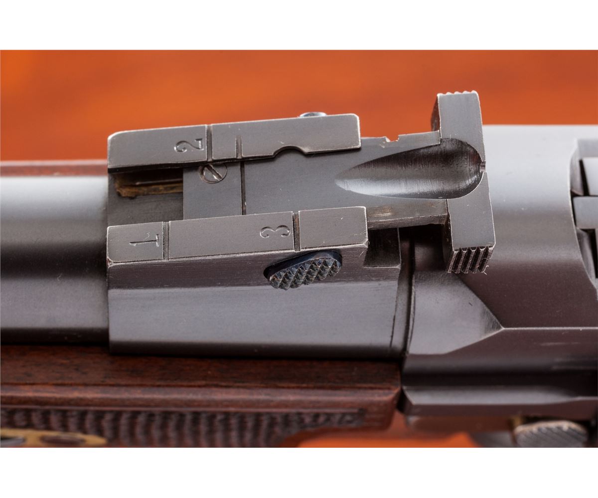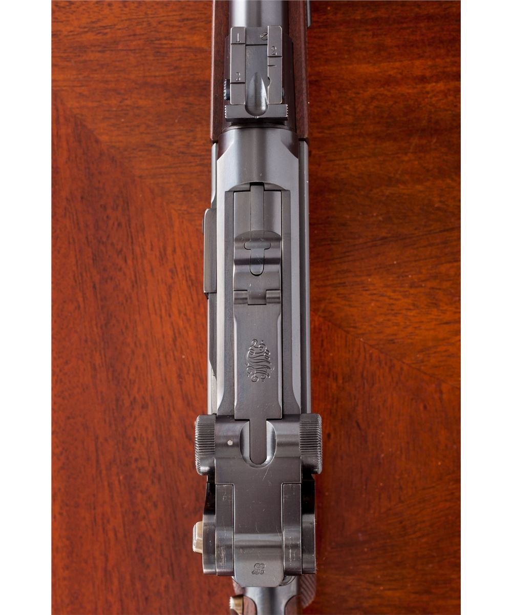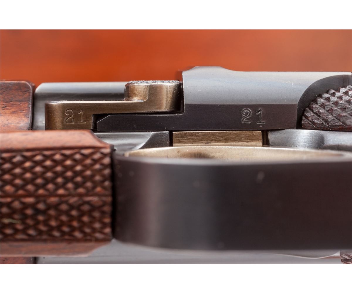 Rare Possibly One-of-a-Kind .45 Cal. Model of 1906 ''GL'' Luger Carbine, #21, .45 cal., 11-1/2'' barrel, blue finish with straw small parts, checkered walnut grips and forend, as well as checkered detachable buttstock with matching numbered attaching iron. The late Ralph Shattuck stated that he purchased this gun in 1982 and it remained in his personal collection for over 25 years, before being acquired by our consignor. Mr. Shattuck further stated that this Carbine was purchased from the Ronald Morton estate in Troy, MT. Mr. Morton's half-brother, Kenneth Morton, was named after his relative Major Kenneth Morton, who was involved in the early 1900s weapons test trials. The grip angle remains the same as the earliest test Lugers. Carbine additionally features grip safety, round knurled toggle knobs, serrated thumb safety with lower portion polished bright, extractor marked ''Loaded'', with unique stock lug and attaching iron, which features an additional lower prong for added stability when firing its larger caliber. This Carbine differs from the military .45 ACP Test Lugers in that it is chambered for .45 F.A. 4-06 round, which is one millimeter longer than .45 ACP. Chamber area is blank, oversized DWM markings to central toggle link, with ''GL'' monogram to back edge of rear toggle link; three-position Carbine style sight with ramp and silver bead front sight. Carbine also includes a period sling and one round of .45-06 ammunition. Complete in period emerald green velvet case with leather straps and nickel hardware. This exact firearm was listed on Mr. Shattuck's website ''World of Lugers'' and priced at $1,000,000 as late as 2008. As the DWM factory has suffered mergers, reorganizations and two World Wars, there is currently no documentation linking this firearm to DWM. If in fact this documentation were to surface, this particular firearm would easily be worth $450,000-$600,000. Condition to Carbine is excellent with light wear in actioning areas. Checkering remains mostly sharp, however, the grip panels themselves show minor flattening and are of a coarser variety than those found on the 1907 Test Lugers. Action remains crisp, bore is bright, fire blue screws show light wear. Case remains in fine condition with one small abrasion to left portion of lid, with either added or replaced leather strapping; interior with impressions and soiling from pistol and some residual glue from repair to forward strap. Est.: $150,000-$300,000.