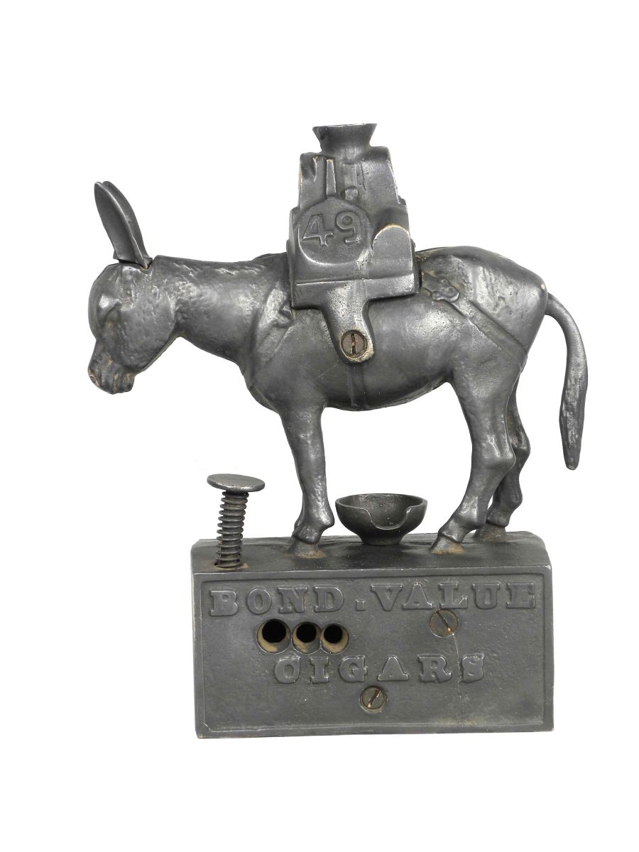 Rare 49ers Cigar Cutter and Gambling Device, advertising Bond -Value Cigars. Cast Iron. Drop a steel ball in the top and it will either move the tail or the ears. In other words, Heads or Tails. Very Good original condition. 7 1/2 X 8 1/2 X 2 1/2 inches.