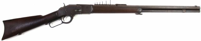 Rare 7 leaf sight Winchester 1873 .44-40 SN33XXXXlever action rifle, 24" barrel, full magazine, set trigger, sling swivels, Beach front sight, standard walnut stocks, made in 1890, a rare combination of features, the rifle remains in good to very good originalcondition, with forward barrel address to accomodate the length or rear sight, all metal surfaces showing an uncleaned brown patina, walnut stocks rate very good with normal light dings and bruises, unsanded with oil rubbed finish, original dust cover intact, action is good, the bore dark. Antique. Factory letter confirms features except front sight. Est. 5500-7000