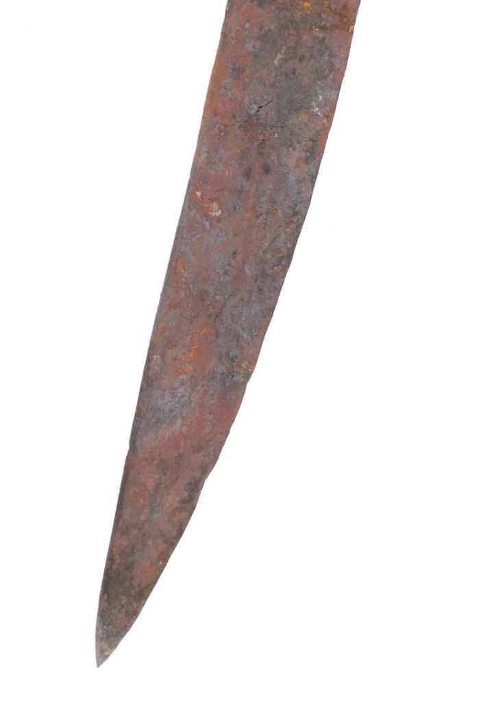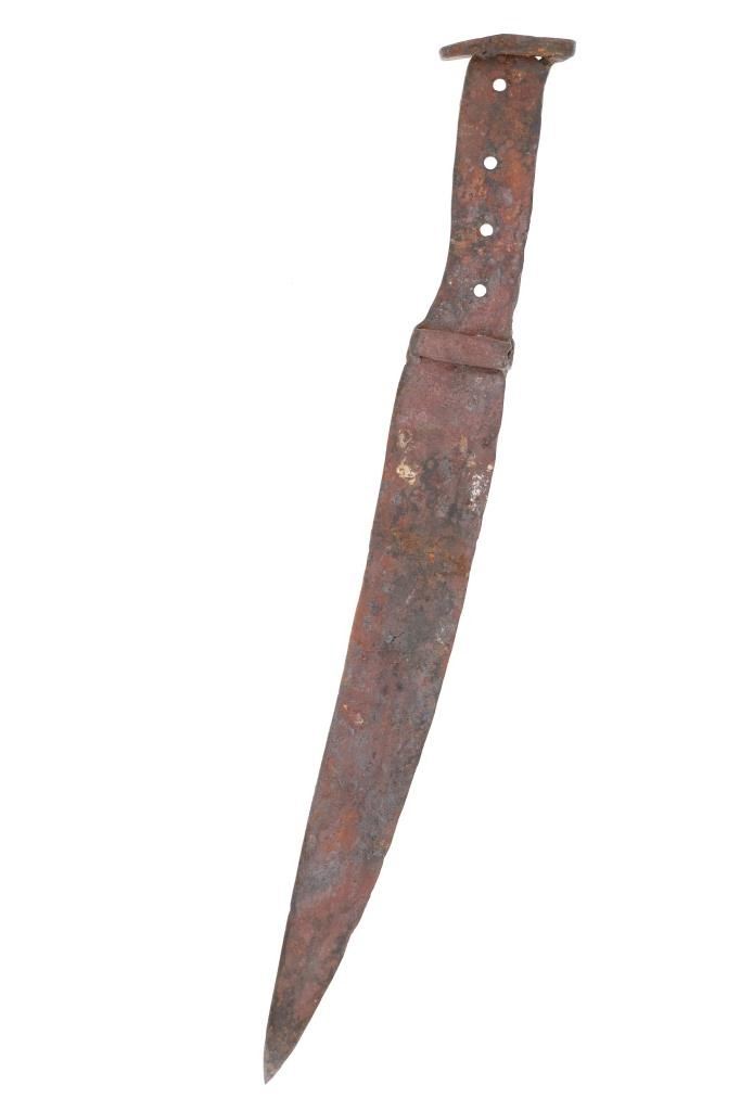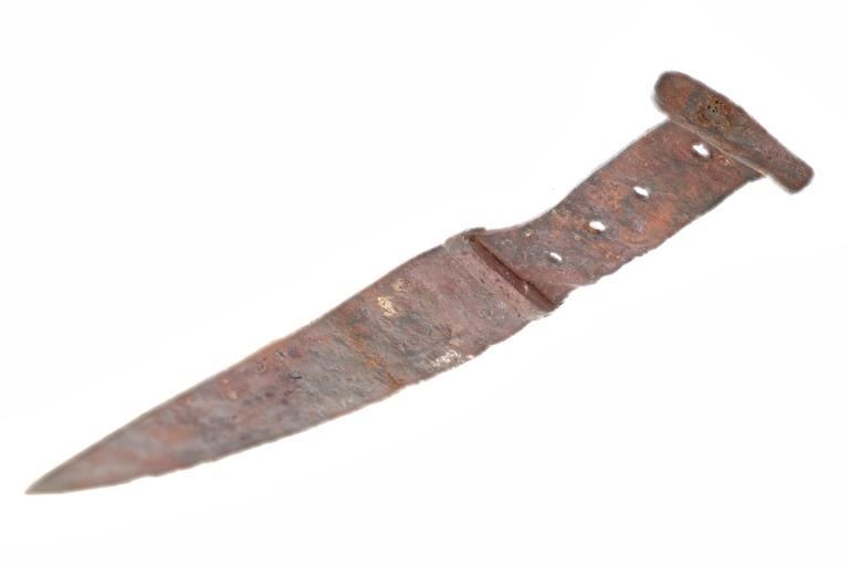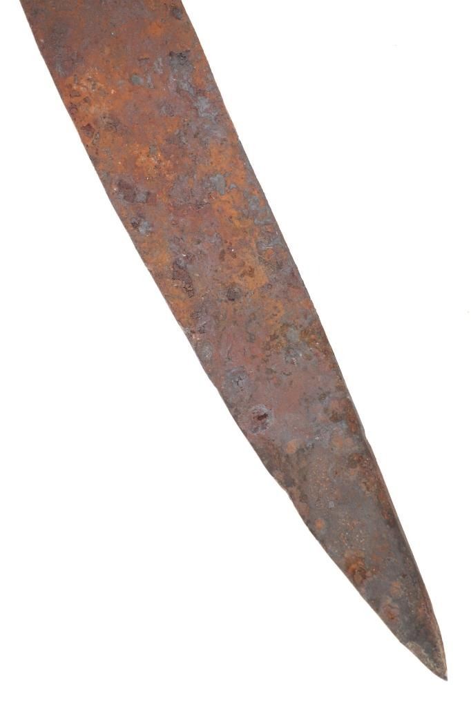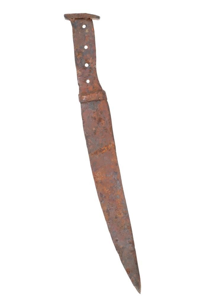 Featured in this lot is this rare 8th-11th C. Viking SCRAMAX knife dagger. The dagger features a wonderfully and professionally crafted iron construction that shows a curved blade that is a full tang with a hilt. The blade would have been wore as a freeman blade to signify status in the culture also known as a Saax. The condition of this this dagger is preserved with a heavy oxidation due to age and use with the hilt missing but otherwise is in preserved overall condition. The measurements of this dagger is 13 3/4" x 1 3/4" x 1/2". The collective weight of this dagger is 6oz.