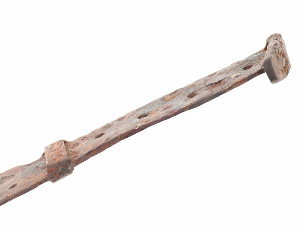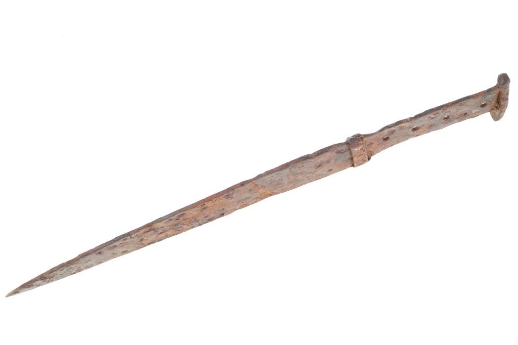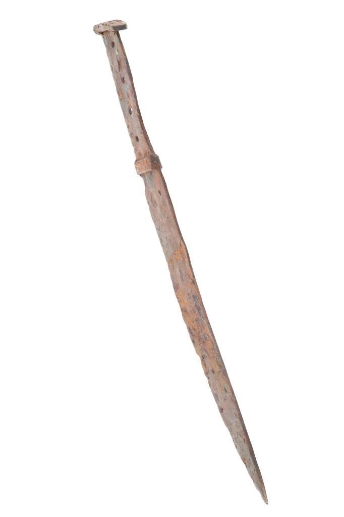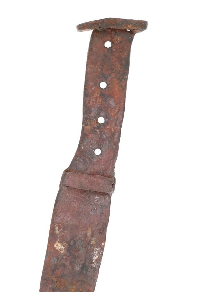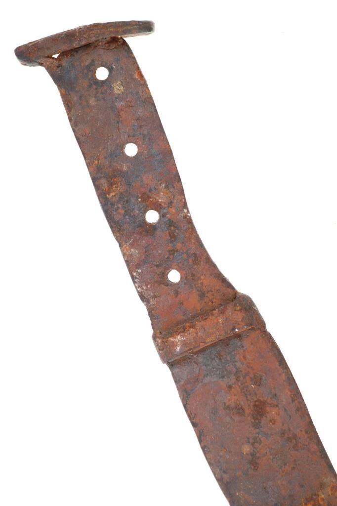 Featured in this lot is this rare 8th-11th C. Viking SCRAMAX knife dagger. The dagger features a wonderfully and professionally crafted iron construction that shows a curved blade that is a full tang with a hilt. The blade would have been wore as a freeman blade to signify status in the culture also known as a Saax. The condition of this this dagger is preserved with a heavy oxidation due to age and use with the hilt missing but otherwise is in preserved overall condition. The measurements of this dagger is 13 3/4" x 1 3/4" x 1/2". The collective weight of this dagger is 6oz.