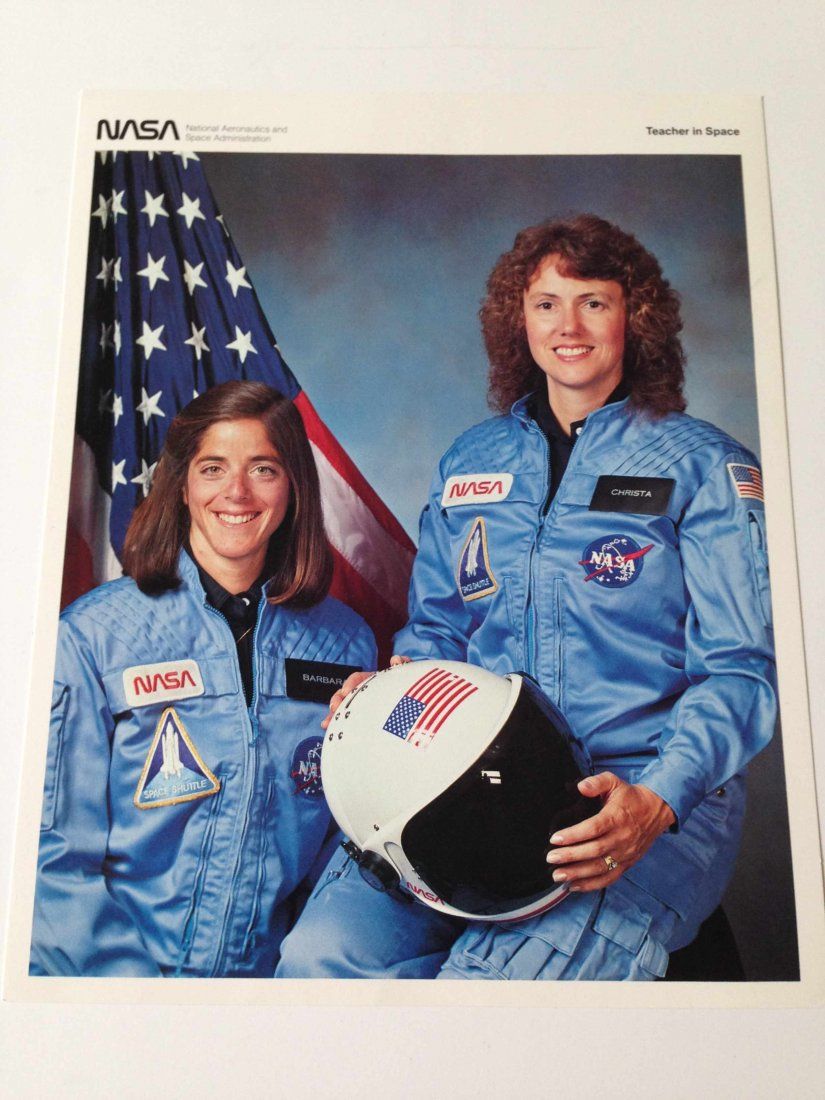 This is a pair of very rare color photographs from the NASA archives featuring members of the crew of the Space Shuttle Challenger, which exploded shortly after take-off in Jan. 1986. The first photo is titled 'Teacher in Space,' and is of Christa McAuliffe, who was the first civilian space flight participant and who perished on the flight, and teacher Barbara Morgan, her back up for the mission. The back of the photo includes a description of the events that were to have happened during the flight. The second photo is a rare and amazing image of the entire crew of that fateful flight.