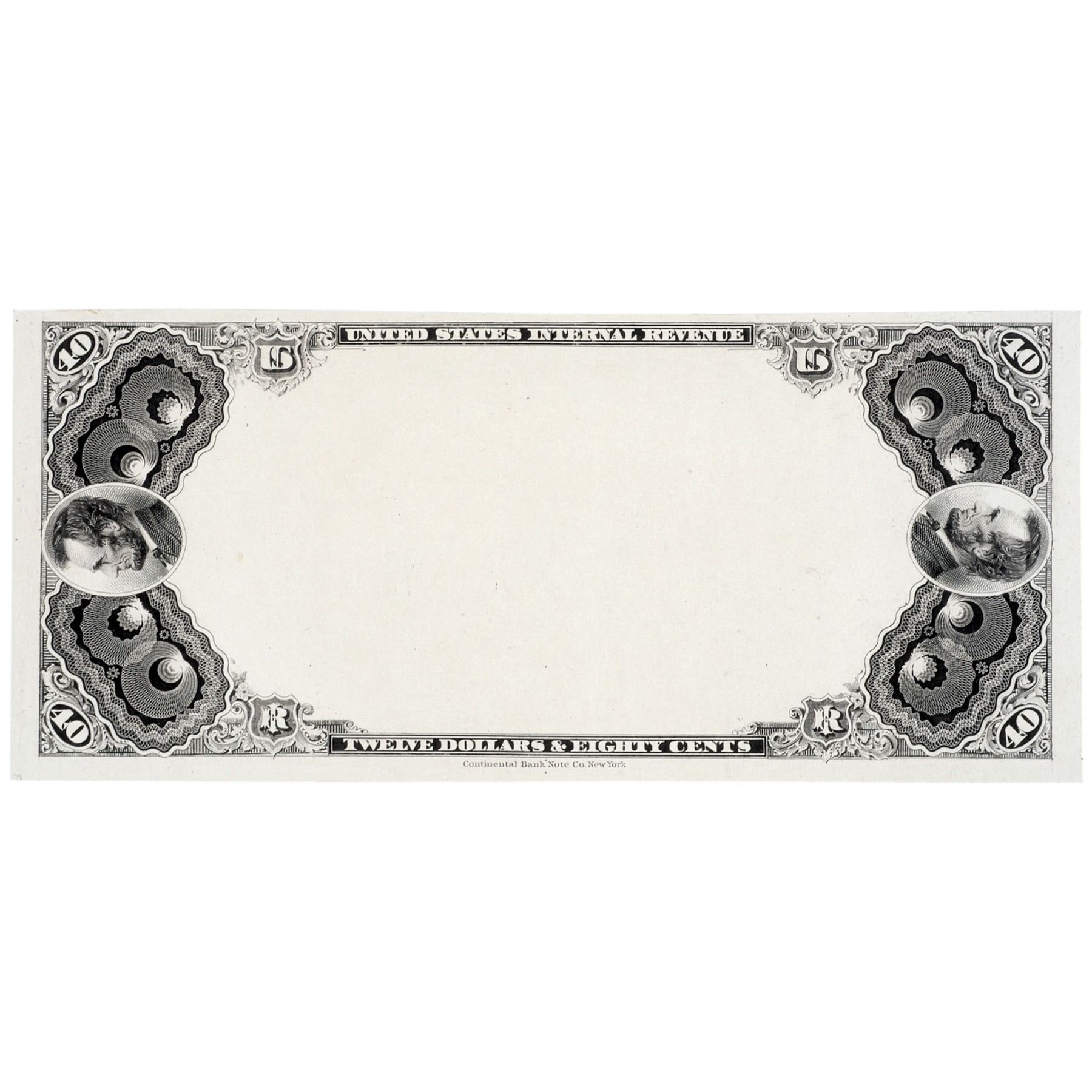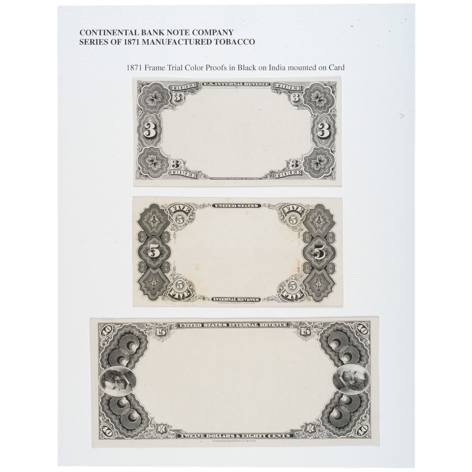 Stamp Reference Book Turner Essays T-64 to T-75. A Complete Set of Six Different Trial Essay Denominations, Including: 1/2, 1, 2 (lazy design), 3, 5 and $12 & Eighty Cents. These represent weights of 1/2 ounce to 40 pounds being United States Internal Revenue Tobacco Tax Stamp Frame Essays, printed in black, on Card. These Six different denominations are a truly magnificent set which have an exceptional and unusual appearance. The most stunning is the 40 pound, being the highest denomination, as it’s left and right side frame lines include a fabulous vignette of a bearded Abraham Lincoln. Each has the small imprint “Continental Bank Note C. New York” below the central obverse frame line. This set is currently placed on two 8.5” x 11” white card sheets, with informative text from a prior display presentation. Simple stamp hinges adhere the Proofs in place and can easily be removed. This denomination Set is extremely rare, the first we have seen or offered. A magnificent addition to any Proof note and/or Abraham Lincoln related collection.