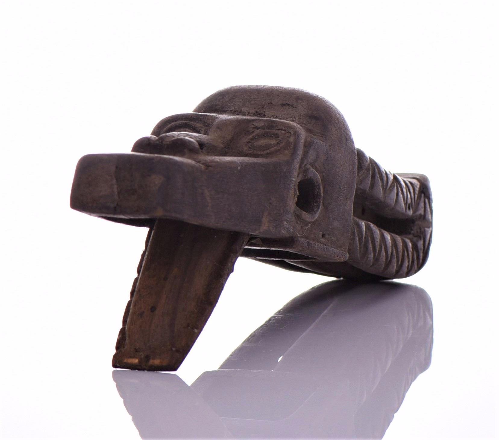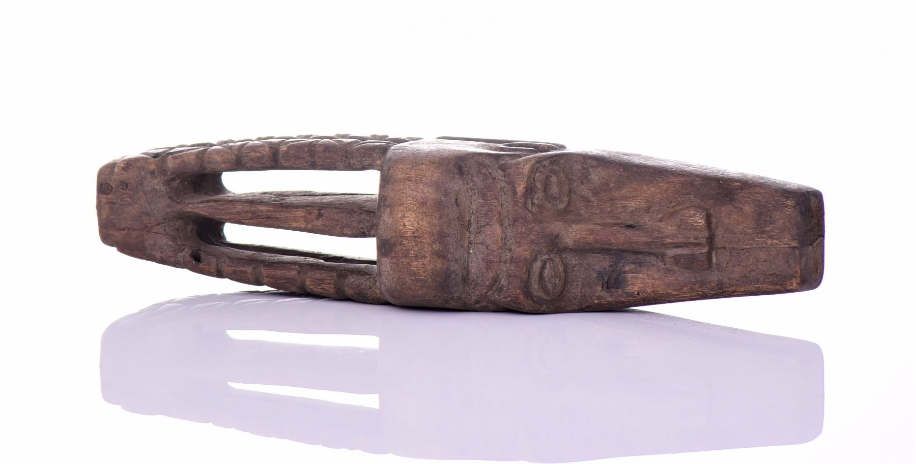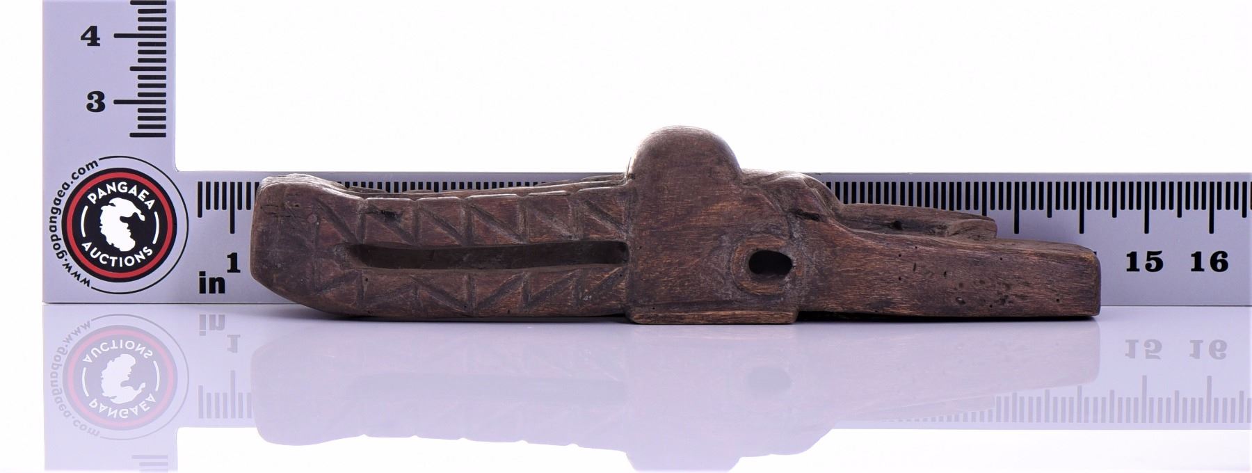 Rare African Dogon Hand Clapper Instrument made From Wood And Leather for Dancing Ceremonies, Mali. Provenance: Ethnographic Tribal Museum Collection (See Auction Catalog Description). Some Lots Have Been On Exhibition And Have A Custom Made Metal Stand Specifically Designed To Fit The Work. Estimated more than 75 yrs. old. African art is a term typically used for the art of Sub-Saharan Africa. A few of the most popular traditional African art was produced by the tribal people of the Fang, Dan, Baoule, Dogon, Senufo, Makonde, Bambara, and San. Most African sculpture was historically in wood and other natural materials that have not survived from earlier than a few centuries ago; older pottery figures can be found from a number of areas. Masks are important elements in the art of many peoples, along with human figures, often highly stylized and in vast variety of styles. Sculpture is most common among "groups of settled cultivators in the areas drained by the Niger and Congo rivers. Direct images of deities are relatively infrequent, but masks in particular were made for religious ceremonies. Later West African cultures developed bronze casting for reliefs, like the Benin Bronzes, to decorate palaces and for highly naturalistic royal heads from around the Yoruba town of Ife, in terracotta as well as metal, from the 12th to 14th centuries. Akan gold weights are a form of small metal sculptures produced over the period 1400–1900; some apparently represent proverbs, contributing a narrative element rare in African sculpture; and royal regalia included impressive gold sculptured elements. Many West African figures are used in religious rituals and are often coated with materials placed on them for ceremonial offerings. Eastern Africans, in many areas shorter of large timber to carve, are known for Tinga Tinga paintings and Makonde sculptures. There is also tradition of producing textile art. Modern Zimbabwean sculptors in soapstone have achieved considerable international success. Southern Africa's oldest known clay figures date from 400 to 600 AD and have cylindrical heads with a mixture of human and animal features. (Wikipedia) Size and/or Weight: See Measurement Photo. (Photos Represent The Lot Condition, Pangaea Auctions)