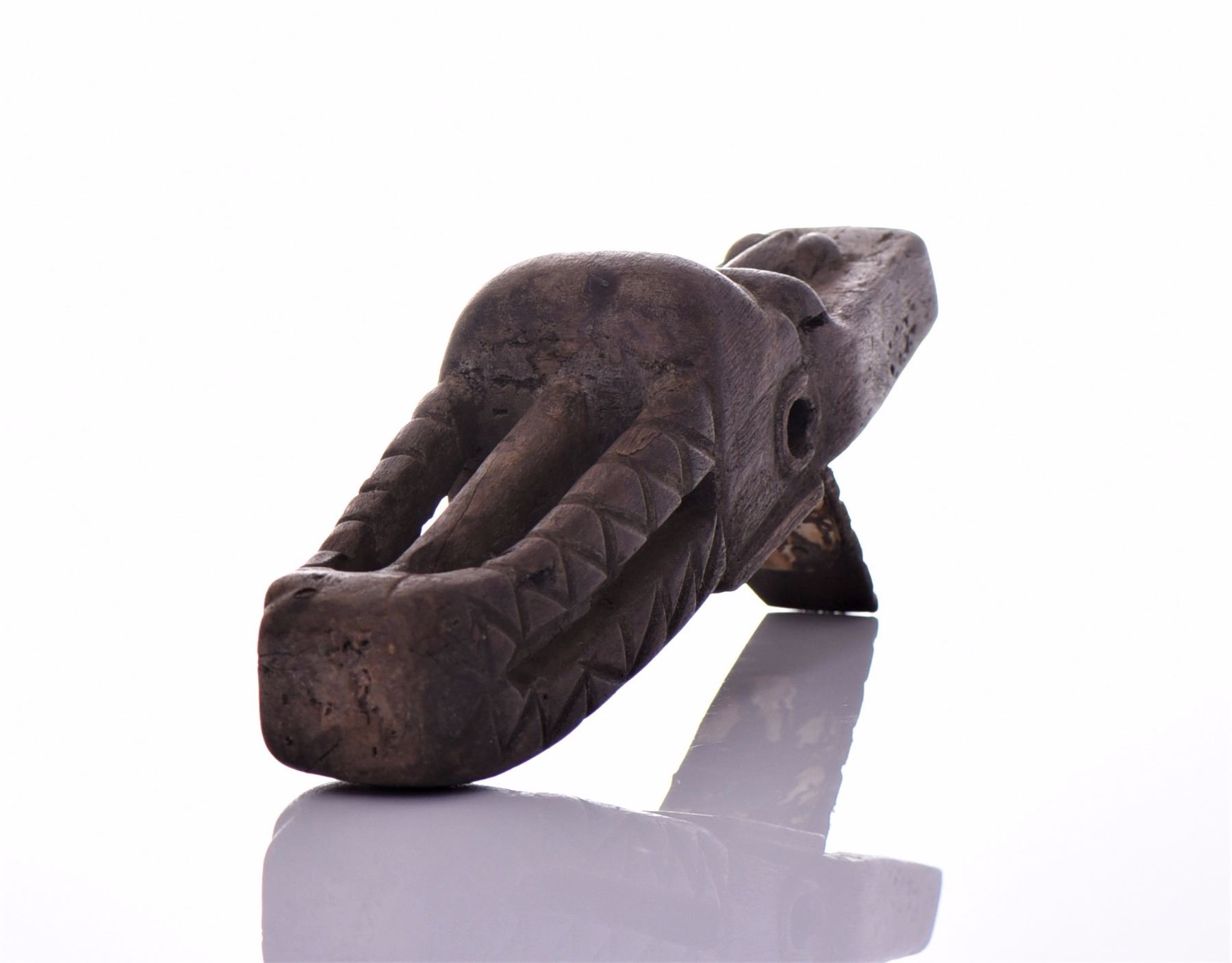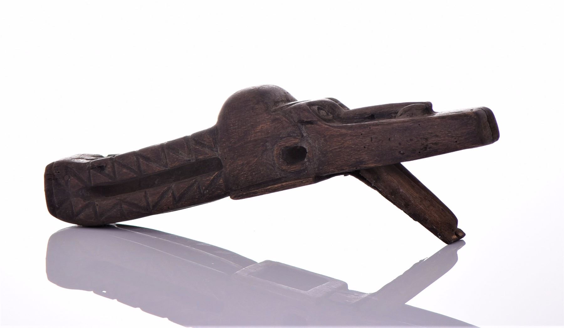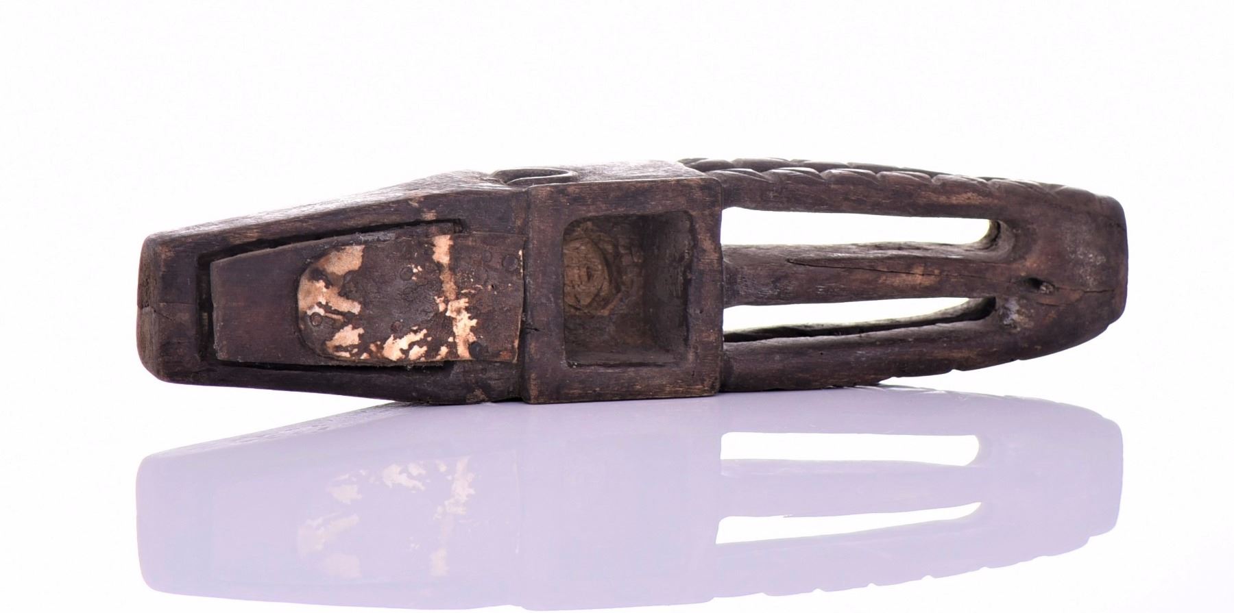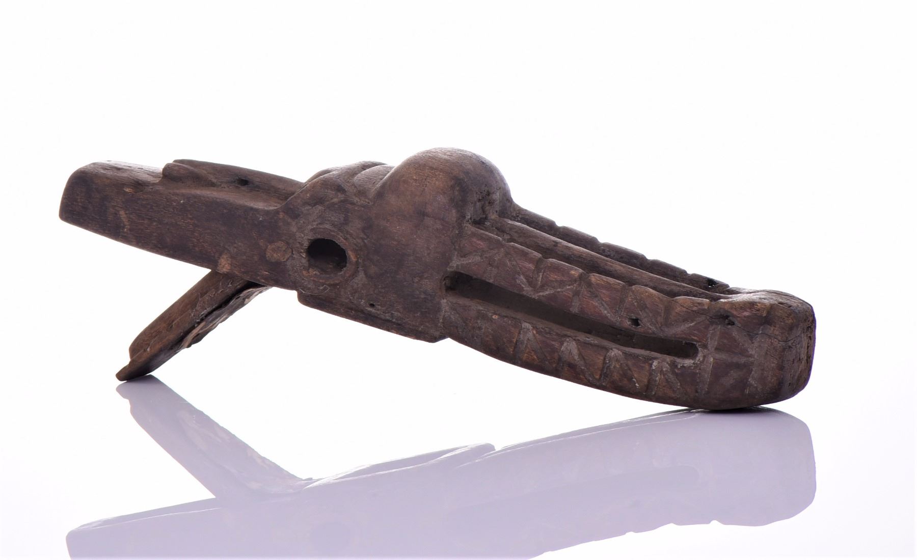 Rare African Dogon Hand Clapper Instrument made From Wood And Leather for Dancing Ceremonies, Mali. Provenance: Ethnographic Tribal Museum Collection (See Auction Catalog Description). Some Lots Have Been On Exhibition And Have A Custom Made Metal Stand Specifically Designed To Fit The Work. Estimated more than 75 yrs. old. African art is a term typically used for the art of Sub-Saharan Africa. A few of the most popular traditional African art was produced by the tribal people of the Fang, Dan, Baoule, Dogon, Senufo, Makonde, Bambara, and San. Most African sculpture was historically in wood and other natural materials that have not survived from earlier than a few centuries ago; older pottery figures can be found from a number of areas. Masks are important elements in the art of many peoples, along with human figures, often highly stylized and in vast variety of styles. Sculpture is most common among "groups of settled cultivators in the areas drained by the Niger and Congo rivers. Direct images of deities are relatively infrequent, but masks in particular were made for religious ceremonies. Later West African cultures developed bronze casting for reliefs, like the Benin Bronzes, to decorate palaces and for highly naturalistic royal heads from around the Yoruba town of Ife, in terracotta as well as metal, from the 12th to 14th centuries. Akan gold weights are a form of small metal sculptures produced over the period 1400–1900; some apparently represent proverbs, contributing a narrative element rare in African sculpture; and royal regalia included impressive gold sculptured elements. Many West African figures are used in religious rituals and are often coated with materials placed on them for ceremonial offerings. Eastern Africans, in many areas shorter of large timber to carve, are known for Tinga Tinga paintings and Makonde sculptures. There is also tradition of producing textile art. Modern Zimbabwean sculptors in soapstone have achieved considerable international success. Southern Africa's oldest known clay figures date from 400 to 600 AD and have cylindrical heads with a mixture of human and animal features. (Wikipedia) Size and/or Weight: See Measurement Photo. (Photos Represent The Lot Condition, Pangaea Auctions)