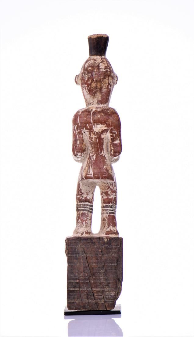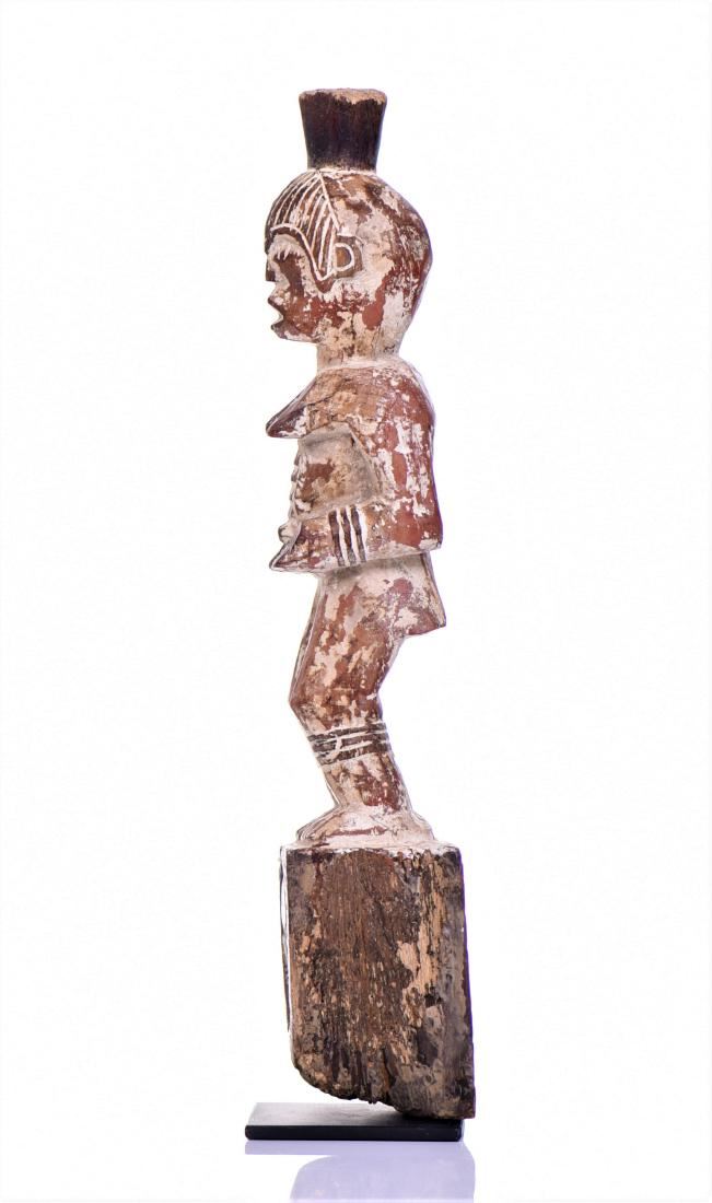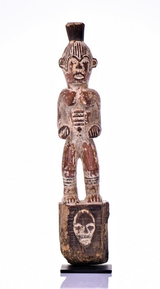 Rare African Igbo (Ibo) Altar Shrine Mount With A Skull Image Carved Into The Wood, Nigeria. Provenance: Ethnographic Tribal Museum Collection (See Auction Catalog Description). Some Lots Have Been On Exhibition And Have A Custom Made Metal Stand Specifically Designed To Fit The Work. Estimated more than 75 yrs old. African art is a term typically used for the art of Sub-Saharan Africa. A few of the most popular traditional African art was produced by the tribal people of the Fang, Dan, Baoule, Dogon, Senoufo, Makonde, Bambara, and San. Most African sculpture was historically in wood and other natural materials that have not survived from earlier than a few centuries ago; older pottery figures can be found from a number of areas. Masks are important elements in the art of many peoples, along with human figures, often highly stylized and in vast variety of styles. Sculpture is most common among "groups of settled cultivators in the areas drained by the Niger and Congo rivers. Direct images of deities are relatively infrequent, but masks in particular were made for religious ceremonies. Later West African cultures developed bronze casting for reliefs, like the Benin Bronzes, to decorate palaces and for highly naturalistic royal heads from around the Yoruba town of Ife, in terracotta as well as metal, from the 12th to 14th centuries. Akan gold weights are a form of small metal sculptures produced over the period 1400–1900; some apparently represent proverbs, contributing a narrative element rare in African sculpture; and royal regalia included impressive gold sculptured elements. Many West African figures are used in religious rituals and are often coated with materials placed on them for ceremonial offerings. Eastern Africans, in many areas shorter of large timber to carve, are known for Tinga Tinga paintings and Makonde sculptures. There is also tradition of producing textile art. Modern Zimbabwean sculptors in soapstone have achieved considerable international success. Southern Africa's oldest known clay figures date from 400 to 600 AD and have cylindrical heads with a mixture of human and animal features. (Wikipedia) Size and/or Weight: See Measurement Photo. (Photos Represent The Lot Condition.)