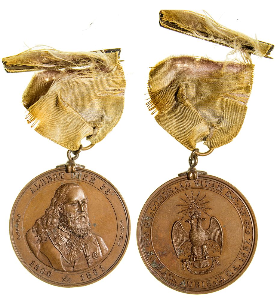 c1891 Obv. So Mas Juris U.S.A. obv. Gr. Comdr. Ad Vitem S.C. 33. rev. Albert Pike 330 obv. 1857. rev. 1809 and 1891. Rare Albert Pike Commemorative Medal issued by The Supreme Council Southern Jurisdiction. Albert Pike was the founder of the Modern Scottish Rite as we know it today. General, Statesman, Musician and Author as well as one of the greatest mystics of all time. Dates are Albert Pike birth and death and 1857 was the first publication of the Magnum Opus. This medal was issued as a special badge of honor for Grand Officers. A must have for the Civil War or Masonic Collector. Heavy Copper and worn ribbon. - HKA#65085