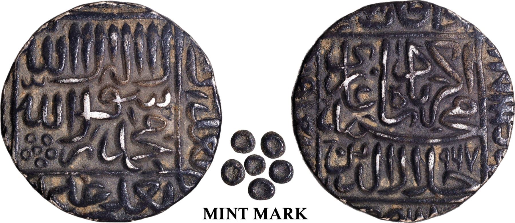 Akbar (AH 963-1014/1556-1605 AD), Gwaliar Mint, Silver Rupee, AH 967, Obv: Arabic legend The Kalima Shahada & beautiful mint mark within a square, the four Caliphs' name in margin, Rev: Persian legend "Jalal ud din Muhammad Akbar Badshah Ghazi" and Hijri year 967 within a square & "zarb Gwaliar" partly visible at margin, 11.52g, 26.16mm, (Unlisted in KM), lovely patina, sharply struck, no test marks, choice quality, almost Uncirculated, Rare in this grade.