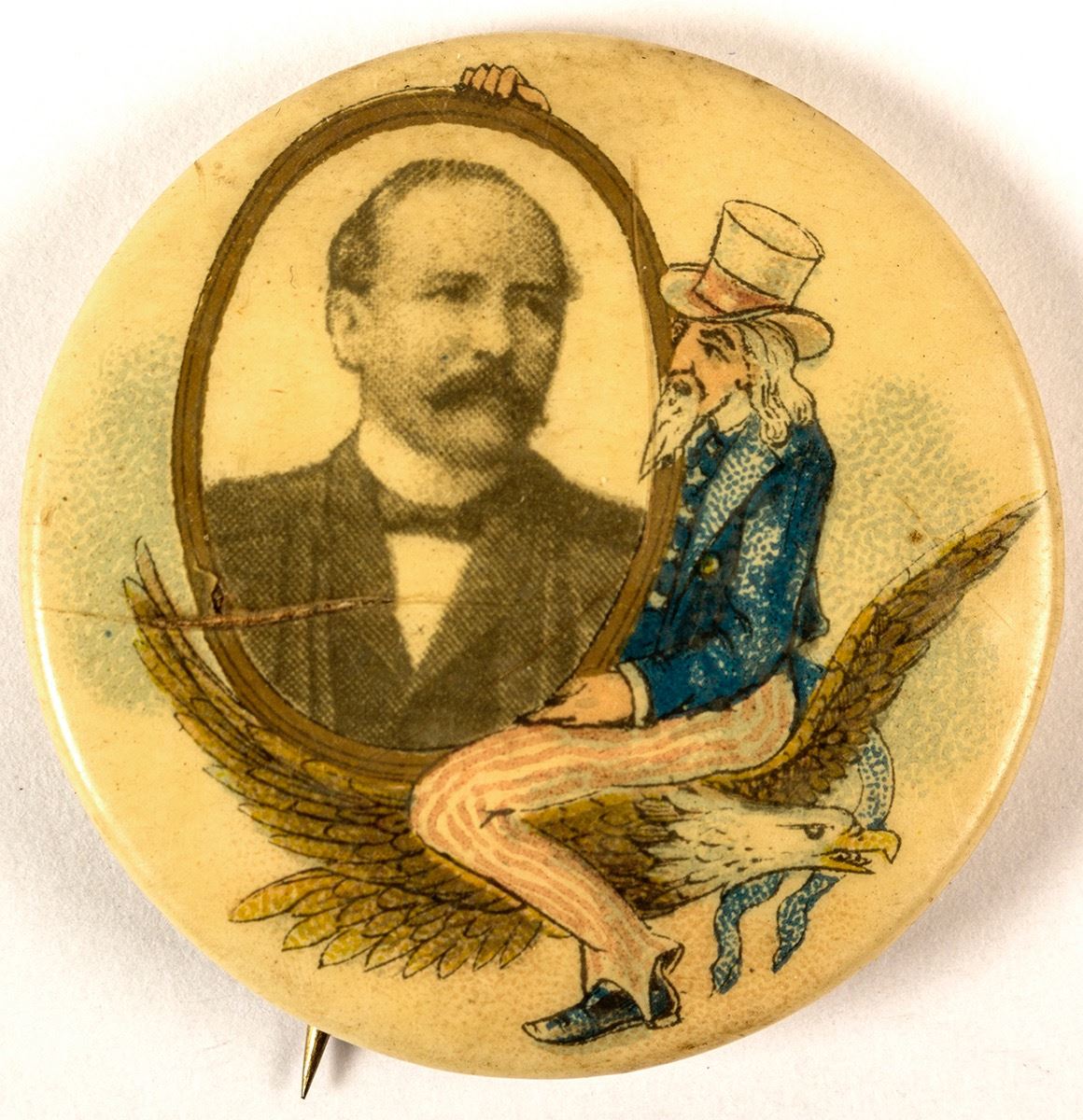 This rare button measures 1.25". Featuring a Parker head illustration next to Uncle Sam adorned in red, white and blue tails featuring stars and stripes. Uncle Sam has a bald eagle below him. Paper back , made by Badge and Novelty Company, Baltimore, Maryland. Date: c.1904 Location: HWAC# 50250