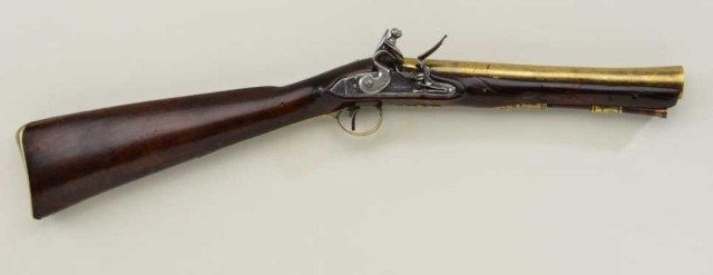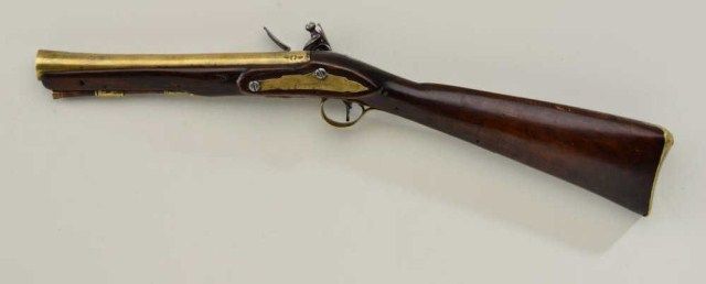 Rare American Flintlock Martial Blunderbuss by “Miles” with London marked brass barrel showing “PRO and VED” inspectors marks for the state of Pennsylvania inspectors Robert Orr and E. Dagget circa 1798-99. Thebarrel is period script inscribed “Aetolian Waterloo” which was part of the emergency relief committee of Philadelphia and they were a special unit of light infantry who trained in a field at the end of WaterlooStreet. The word Aetolian was an ancient league which means “a confederacy of independence and the means to defend it”. In 1798 there were rumors of war with France and possible invasion. The congress andstates took action to form regiments and militias for our young countries defense. Miles was a well known contractor for muskets and pistols and this is the only blunderbuss of its type known by this early Pennsylvania gun maker. Physical description; The lock shows some pitting, light cleaning and would be rated as good with its original small parts. The stock has been broken and shows repairs and restorations and some wood added