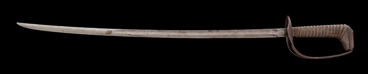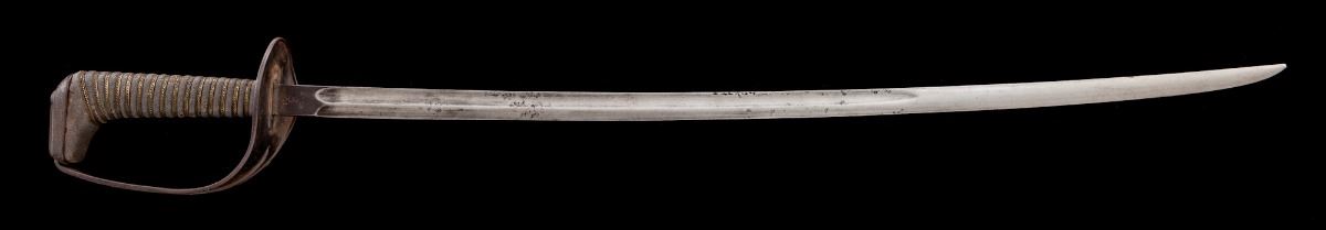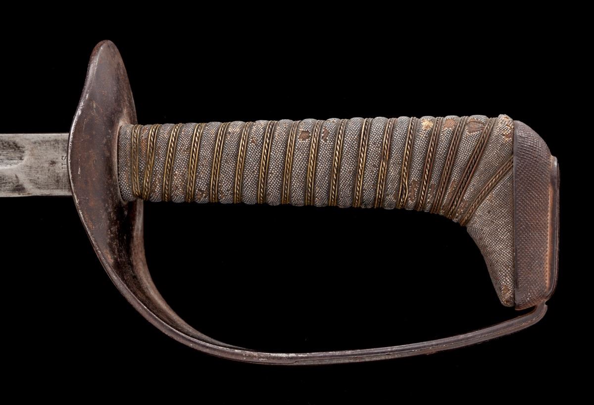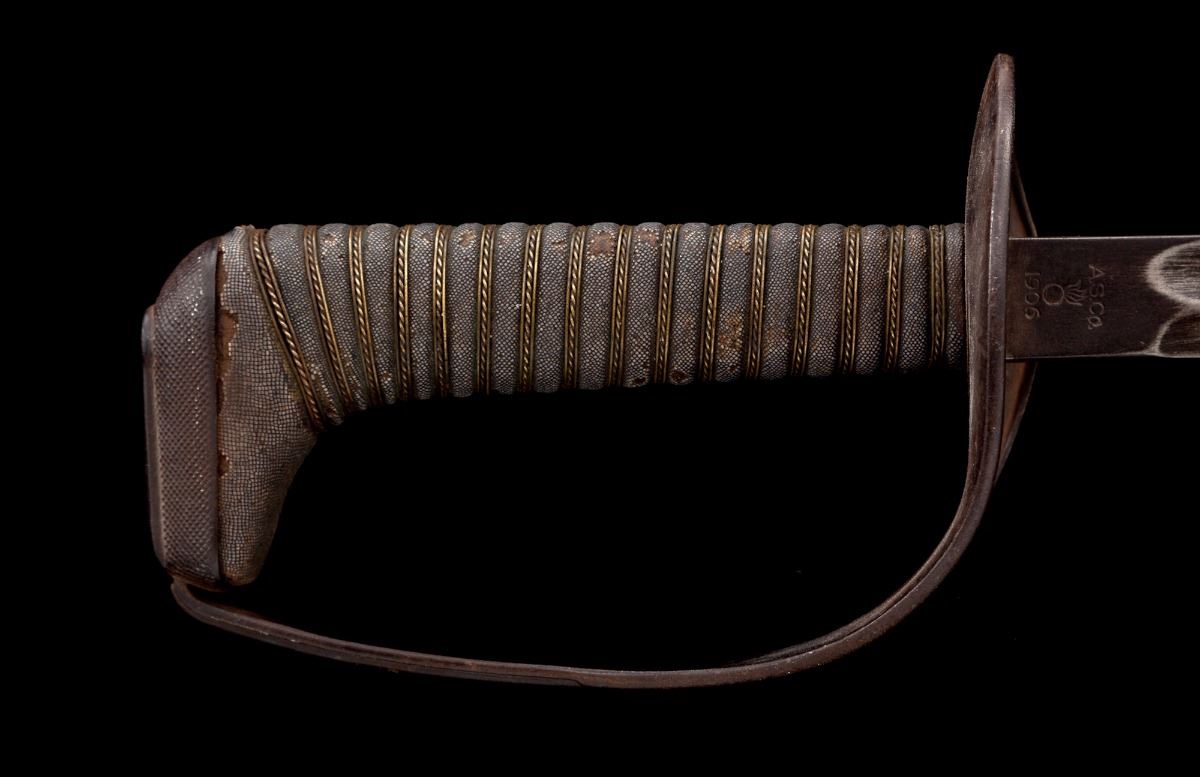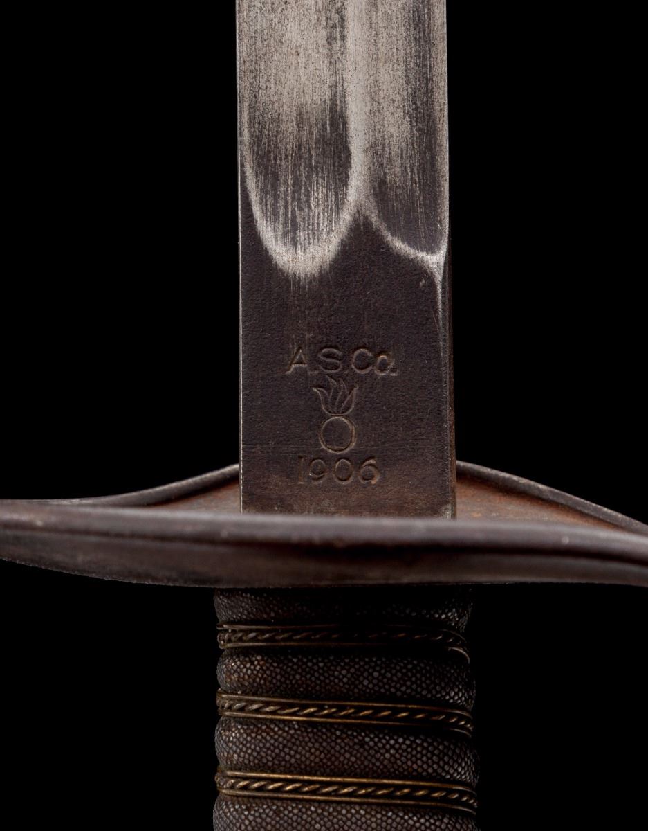 Rare U.S. WWI Model 1906 Experimental Cavalry Saber, by Ames, 29.75'' blade marked ''U.S.'' on one side and ''A.S. Co. / (flaming bomb) / 1906'' (Ames Sword Co.) on the obverse; wood grip is 6'' in length and covered in fishskin, which is wound with one strand of twisted and two strands of plain brass wire. Pommel cap with iron that has been crosshatched to resemble the fishskin texture. No scabbard. Condition is good showing crazing to fishskin between wire wrap and at top edge where it meets pommel cap; wire wrap to grip is tight and complete. Blued guard shows thinning and has toned to an overall dark patina, as well as scattered fine surface rust. Blade shows pitting, dark spotting and signs of being polished. Blade marking remains well defined and clear. Est.: $400-$600.