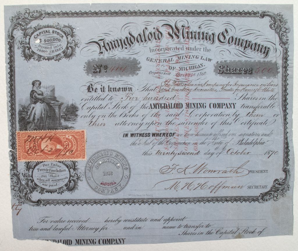 Eagle Harbor, Michigan- Amygdoloid Mining Company Stock Certificate made out to 'The Pennsylvania Company for Insurance on Lives and Granting Annuities, Trustee for Henry White' for 500 shares. Stock Number 414. October 1870. Part of Quincy Mining Company. 5 Known - Michigan Copper Mining Stocks and Bonds by DE Good - Published 2011. Small hole in upper left and bottom left torn - but tear does not interfere with stock.