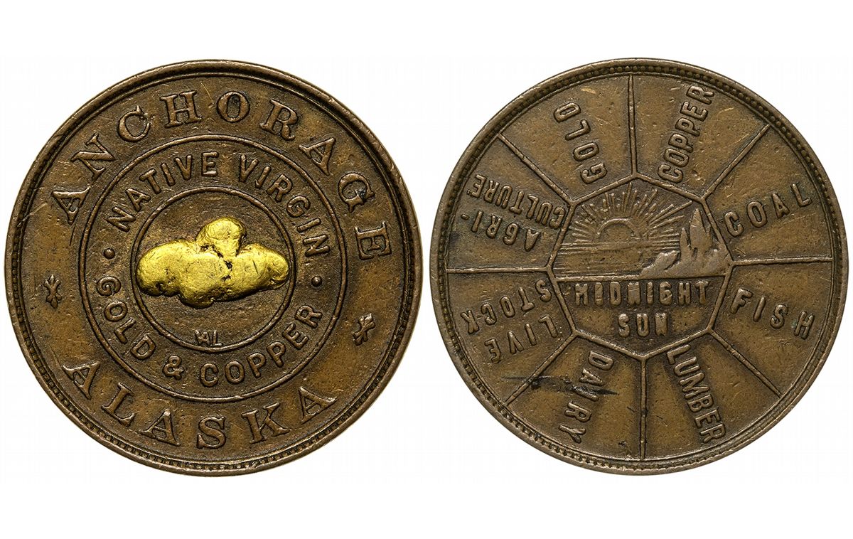 c1890 Rare and wonderful promotional token or medallion from Anchotage AK with a small gold nugget in center. The seller (not token manufacturer) was Walter A. Lord, whose initials can be seen below the nugget on the obverse (the WA are combined). Benice notes these originally came in a box with a pamphlet or information sheet stating the gold was from local streams and the piece "was associated with the construction of the Government railroad." This very important information leads to some new information. Walter A. Lord was born in Massachuttes in 1869. He moved west and ran a jewelry business in Sacramento (1910 census), where he clearly became interested in gold nugget jewelry. By 1912, he had relocated to Fairbanks, in partnership with Robert Simpson. In 1914, The US Goverment voted to provide funds to build/complete a railroad from Seward to Fairbanks. A year into the construction, Anchorage was "created as a railroad construction town" along Ship Creek. Along the way, Lord saw a good opportunity and started a jewelry store in the new town of Anchorage. By 1917 the railroad construction crews peaked at 4500 workers. The railroad was completed in 1923, and President Warren Harding drove the final (gold) spike. Unfortunately, he died on the way back to Washington from severe food poisoning. Lord evidently made this medallion in celebration of the completion of the railroad. There are thought to be less than ten known today. This specimen is x-John J. Ford Collection, lot 22813, Ford XXIII. - HKA#65733