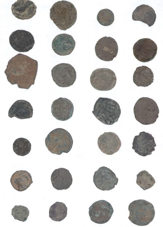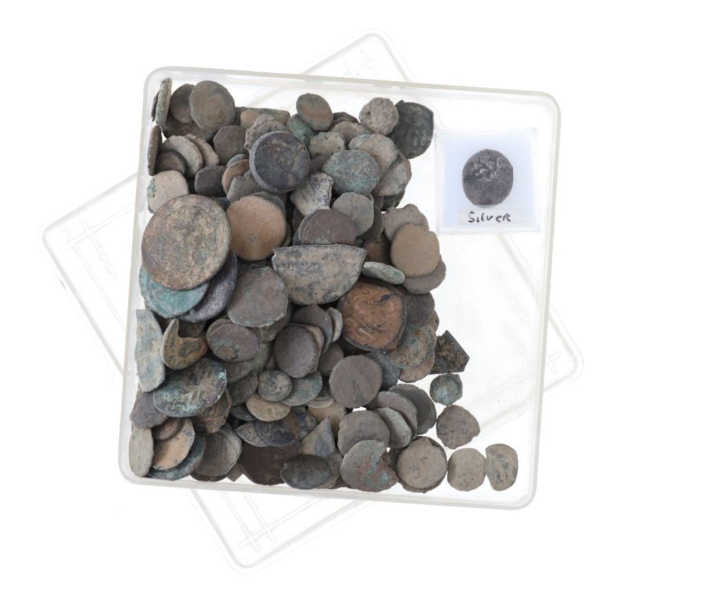 For your consideration is this collection of 278 Roman coins. This collection includes many different sized and shaped coins from the Roman empire and surrounding areas. Money, the foundation of any modem economy, was a concept invented by the ancient Greeks and then revolutionized by the Romans. Modern coins the world over still incorporate design features made standard by Roman emperors. This collection features some larger coins showing some symbols poking through the years of sediment and being underground. Some of the coins show magnetic properties from refining bronze from other ores. There is one pure silver coin but shows no markings. The largest coin measures 1 1/16" in diameter and the smallest ones measure around 2/8" in diameter. The silver coin measures 5/8" in diameter.
