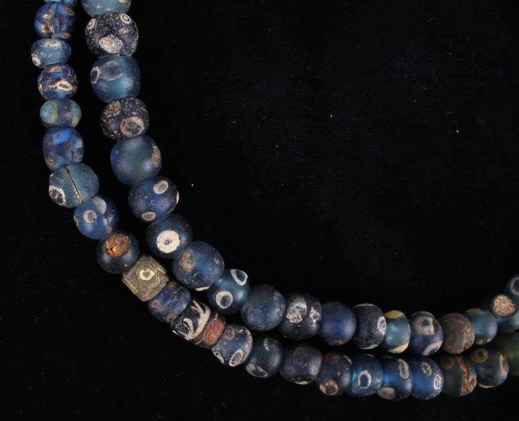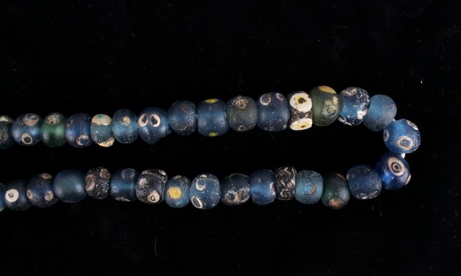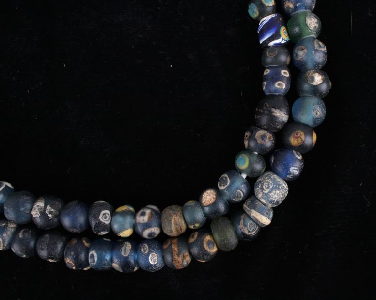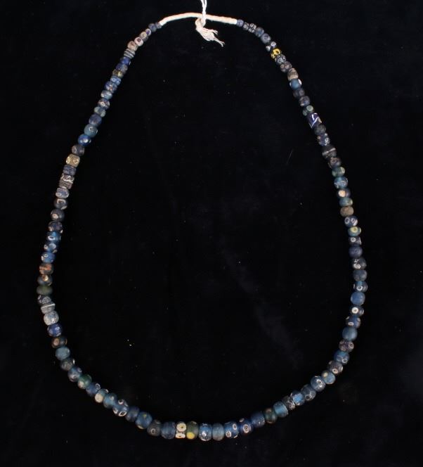 For your consideration is this rare ancient "Roman Eye" glass beads necklace. A lovely strand of 101 glass beads of rounded forms, most with multiple evil eyes, the vast majority presenting beautiful, translucent, blue and green hues with white evil eyes. An incredible strand of fine glass beads intended to protect the wearer against the evil eye. No entity is more recognized for its ability to ward off malevolent forces than the evil eye. This piece has 101 beads in striking cobalt and teal hues created to dispel the curse transmitted via that malicious gaze. Beads show expected surface wear commensurate with age. Some with chips, stable fissures, and/or missing white eye details. Most presenting marvelous translucency and several with sparkling iridescence that has developed over the ages. Roman, Imperial Period, ca. 1st to 3rd century CE, possibly earlier. This piece is approximately 19" long and 41" in circumference. Imagery of the Evil Eye was first recorded by the Mesopotamian approximately 5,000 years ago in cuneiform on clay tablets. Some scholars believe that it may actually have originated as early as the Upper Paleolithic Age. Evil Eye iconography has been found in Jewish, Christian, and Muslim cultures as well as Buddhist and Hindu societies; however, each culture ascribes a similar meaning to it. The evil eye is believed to be a curse cast by a malevolent glare that is typically directed at a person who is unsuspecting and unaware. Many cultures believe that the evil eye can bring about misfortune, injury, or bad luck. For this reason, talismans and beads like these traditionally have been created to protect the wearer against the evil eye.