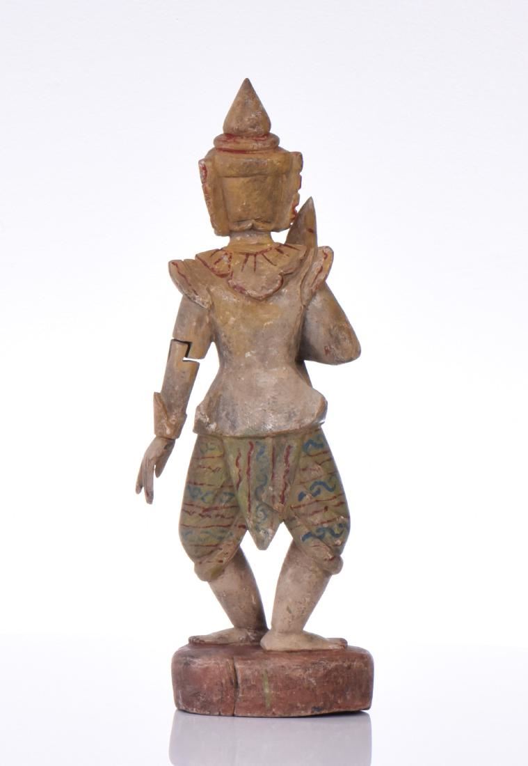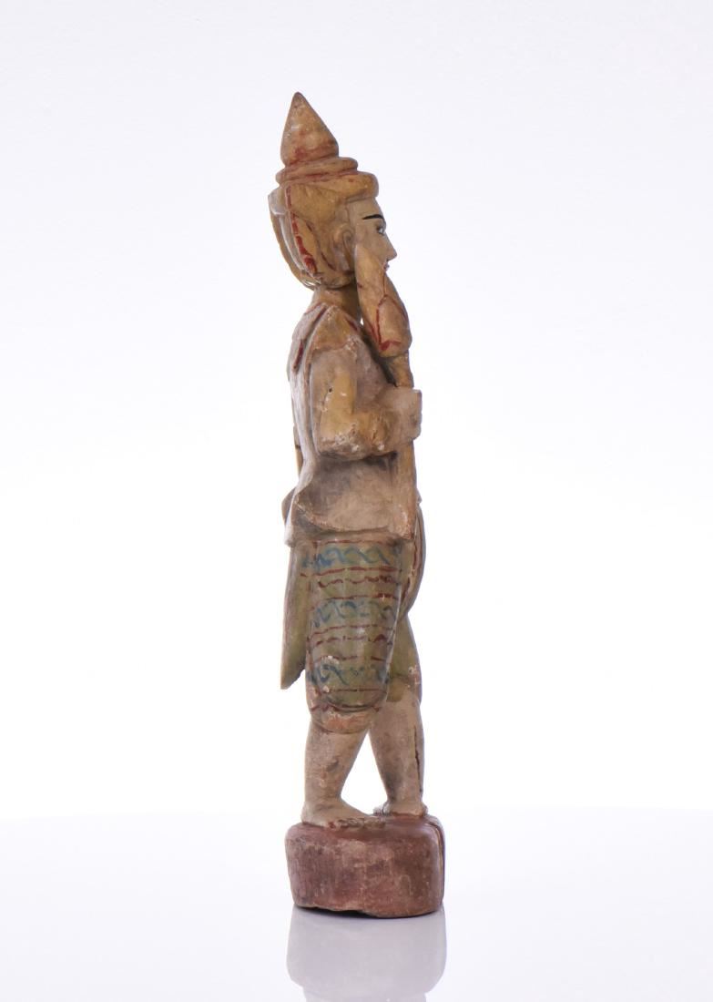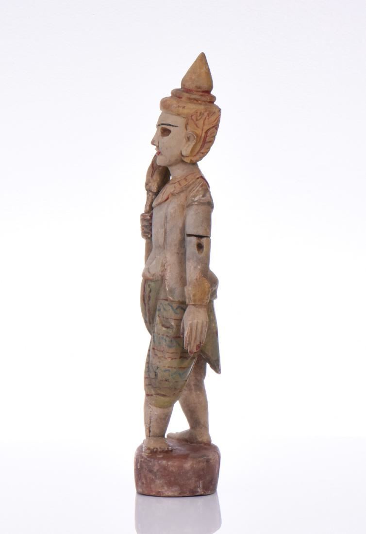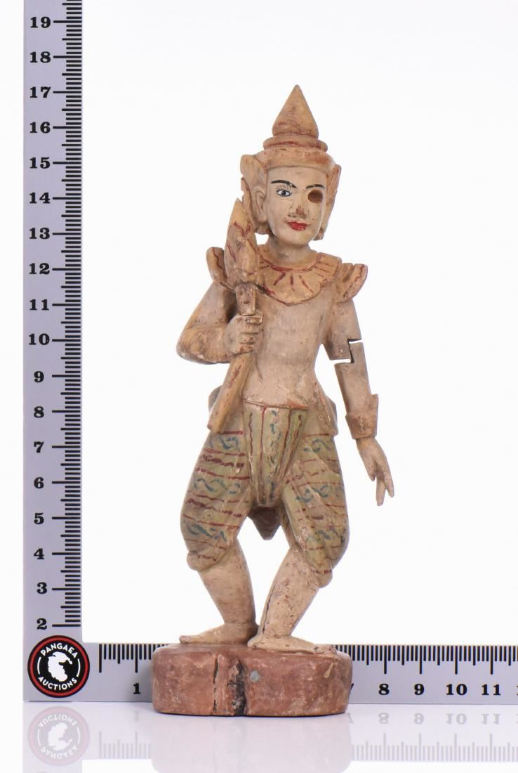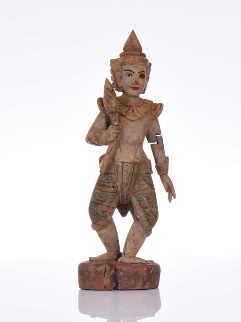 Rare And Unusual India Polychrome Painted Wood Doll With Articulated Arm And Flower. Hand Painted with Inserted Wood Eyes. Provenance: Owner Purchased From A Creepy Doll Collection In Virginia In 1990. Condition Report: Missing Eye. Estimated more than 200 yrs old. Indian art consists of a variety of forms, including pottery, sculpture, paintings, and textiles. Geographically, it spans the entire Indian subcontinent, including what is now India, Pakistan and Bangladesh. A strong sense of design is characteristic of Indian art and can be observed in its modern and traditional forms. The origin of Indian art can be traced to pre-historic Hominid settlements in the 3rd millennium BC. On its way to modern times, Indian art has had cultural influences such as Indus Valley and Hellenistic, as well as religious influences such as Hinduism, Buddhism, Jainism and Islam. In spite of this complex mixture of religious traditions, generally the prevailing artistic style at any time and place has been shared by the major religious groups. In historic art, sculpture in stone and metal, mainly religious, has survived the Indian climate better than other media, and provides most of the best remains. Many of the most important ancient finds that are not in carved stone come from surrounding, drier regions rather than India itself. (Wikipedia) Size: See Ruler Photo. (Photos Represent The Condition Of The Lot.)