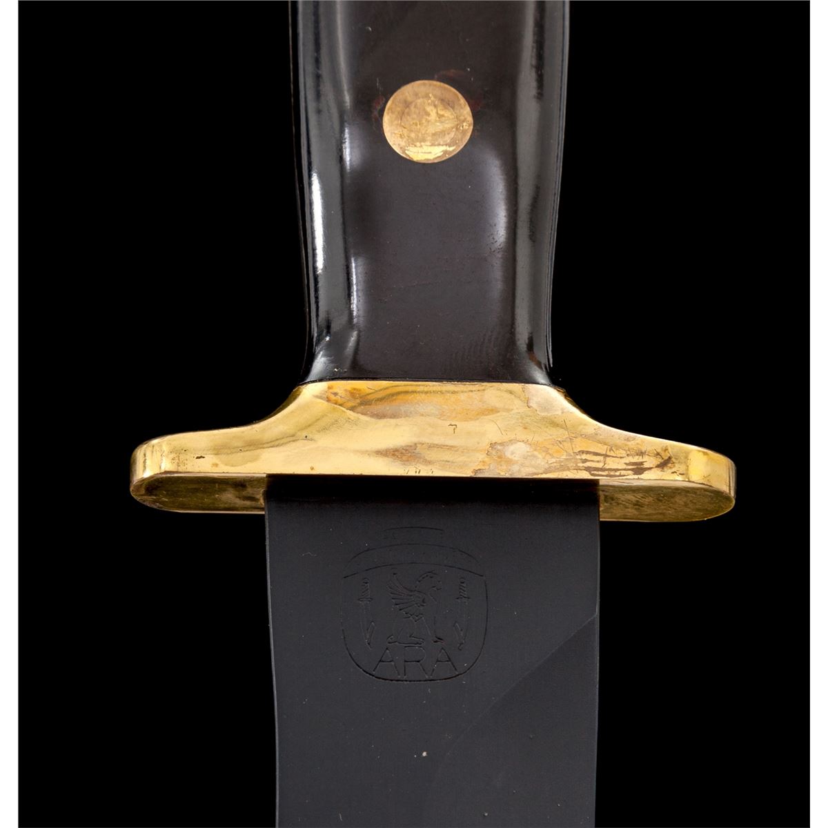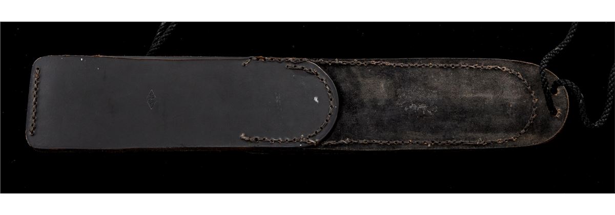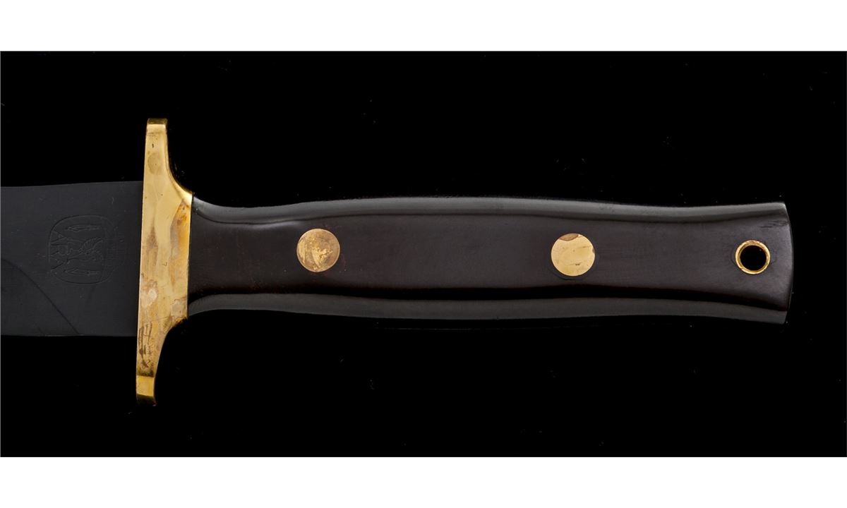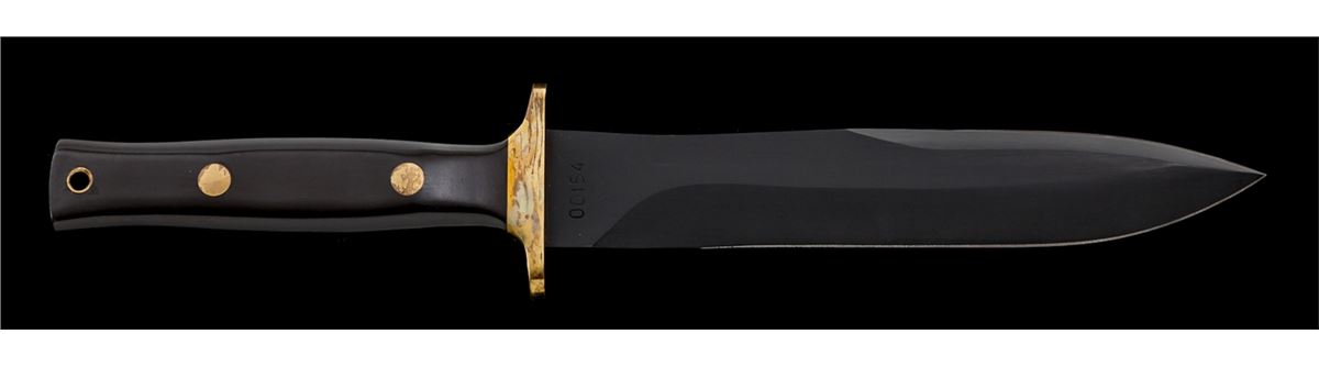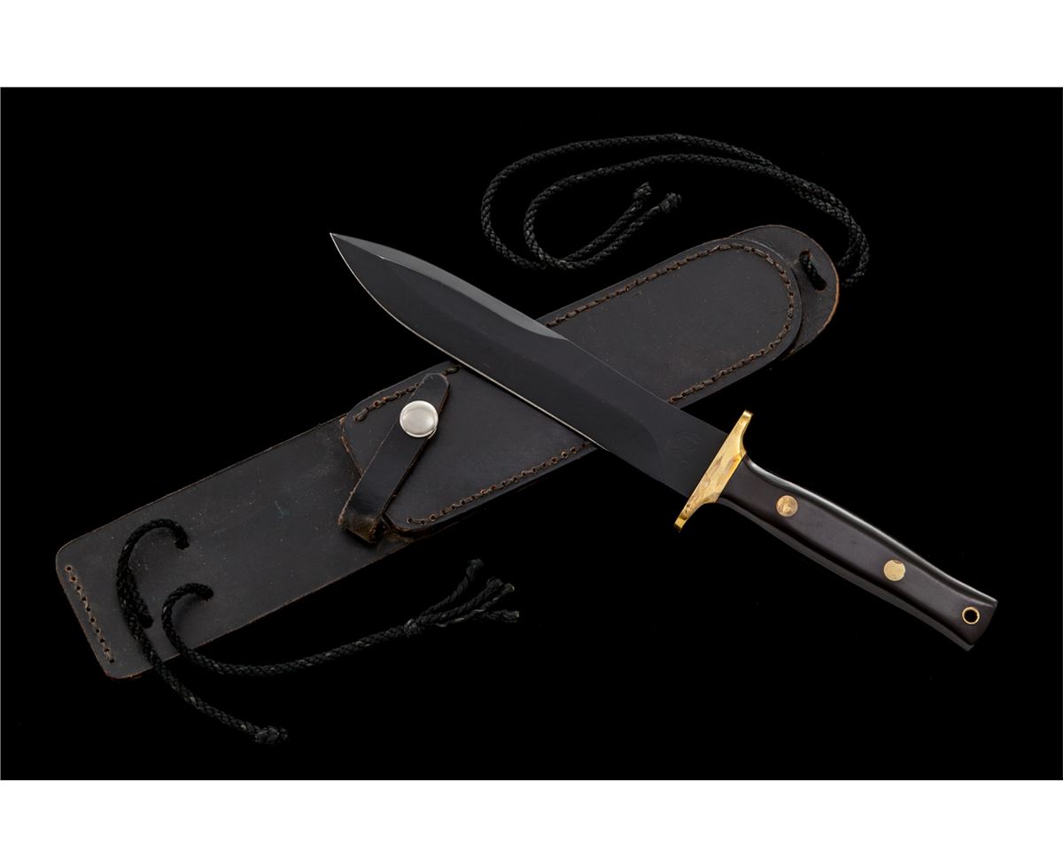 Rare Angus R. Arbuckle Combat Commander Fighting Knife, 6-7/8'' black blade marked on ricasso with ''(Ara Custom Handmade Knives Logo)''; reverse marked ''00154''; 11-3/4'' overall length, brass full guard, micarta grips, brass pins and wrist thong ferrule, with black leather ''Ara'' sheath. Condition is very good to fine overall. Cutting edge appears original with sheath wear to the high edges and flat parts of blade. Brass parts with discoloration due to poor storage. Micarta grips with marks from handling. Sheath with light scuffs and scratches, stitching and seams remain tight. Arbuckle knives are hard to find and the condition would improve greatly if the brass parts were professionally cleaned. Est.: $600-$900.
