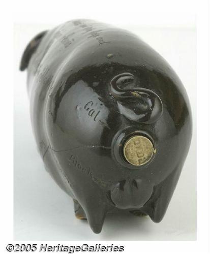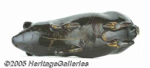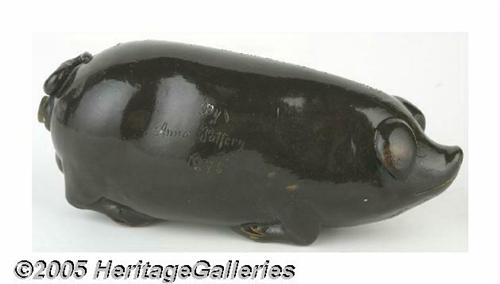 <B>Rare Anna Pottery Albany Slip Pig Bottle</B></I> Made in 1878 by the Kirkpatricks of Anna, Illinois. Highly collectible and very difficult to find are examples of the pieces made by this company. Anna Pottery pieces often take on a folk art quality since many of the items referenced are farms, railroads and towns of the late 1800s. This particular pig is a wonderful example of the "Quickest, cheapest and only safe and reliable route to California and the Black Hills," as stated on one side of the pig. Outlining the rail route of the St. Louis, Kansas City, and Northern Railway, you begin your trip at the pig's mouth, in St. Louis, and then pass through Kansas City on his neck and on to Omaha under his belly. The pig is a total of eight inches long. As you approach his well defined under side, the map notes a stop in the town of Julesburg, which is appropriately located. This map continues on through Sidney, Cheyenne, the Black Hills, and finally California, denoted at the pig's bottom under the tail. This particular pig is inscribed with "By Anna Pottery 1878" on its side. Most of the known examples of this pig were seldom marked in this manner, so for someone this may have been a special edition. This pig is in <I>excellent</B></I> condition. Nicely toned and with very little wear to the bottom, where he has been sitting on his legs and haunches for quite some time. Lot:252