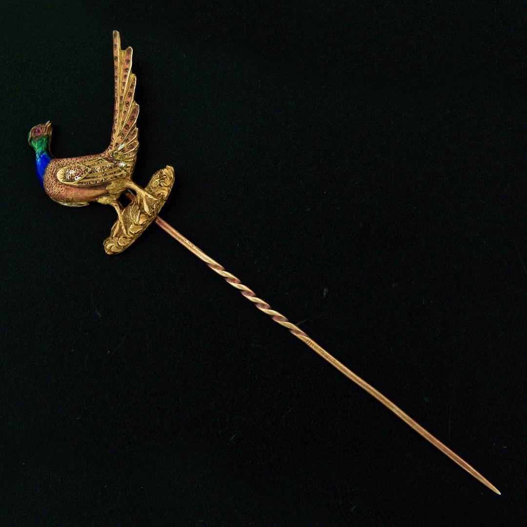 A rare, art nouveau period, solid 18k yellow gold detailed pheasant stick pin brooch featuring 1 round cabochon cut natural ruby (0.03ct) in addition to green and blue enamel work. Measures 94.25x29.55mm and weighs a total of 8.18 grams.