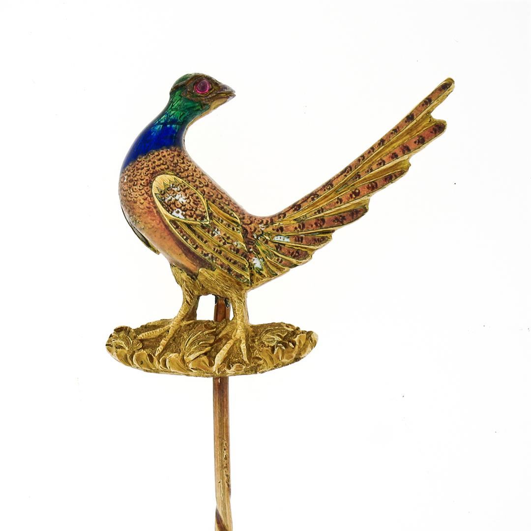 A rare, art nouveau period, solid 18k yellow gold detailed pheasant stick pin brooch featuring 1 round cabochon cut natural ruby (0.03ct) in addition to green and blue enamel work. Measures 94.25x29.55mm and weighs a total of 8.18 grams.