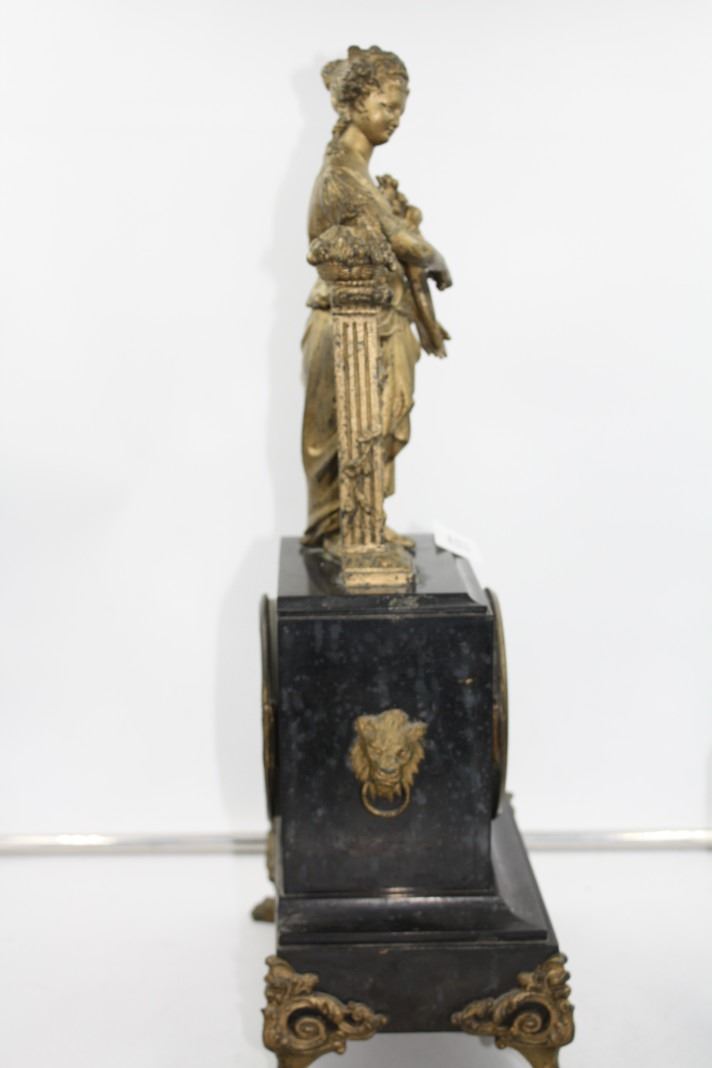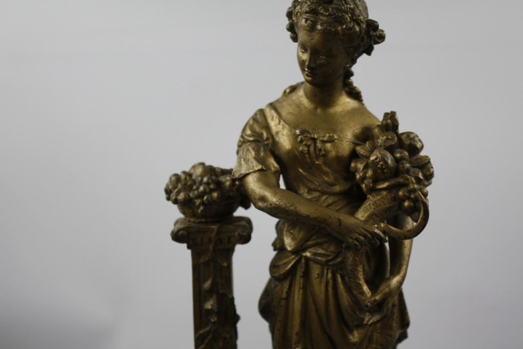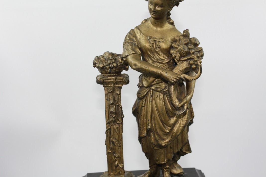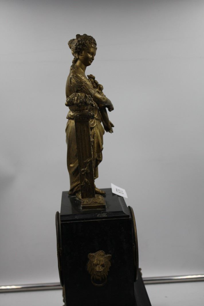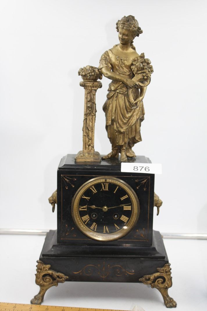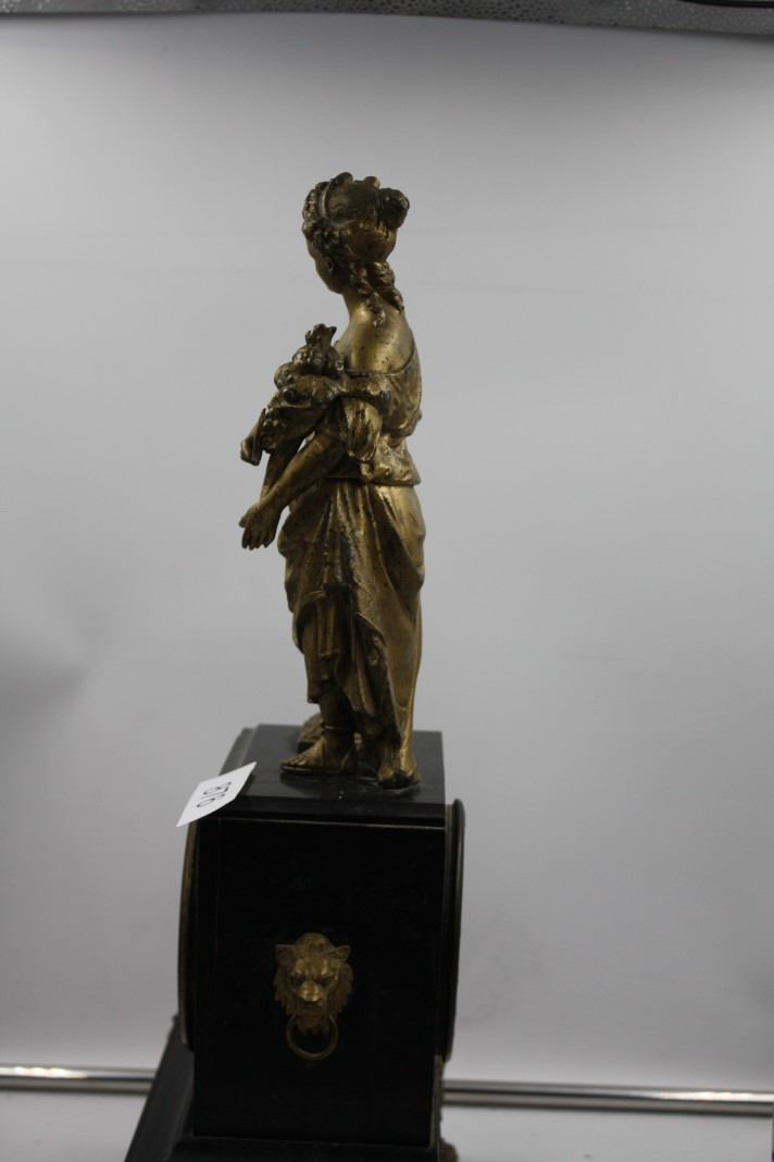 Brass Lady Figurine holding Horn of Plenty with Flowers and Pillar Stand Marble Mantel Clock Lion Heads on the side