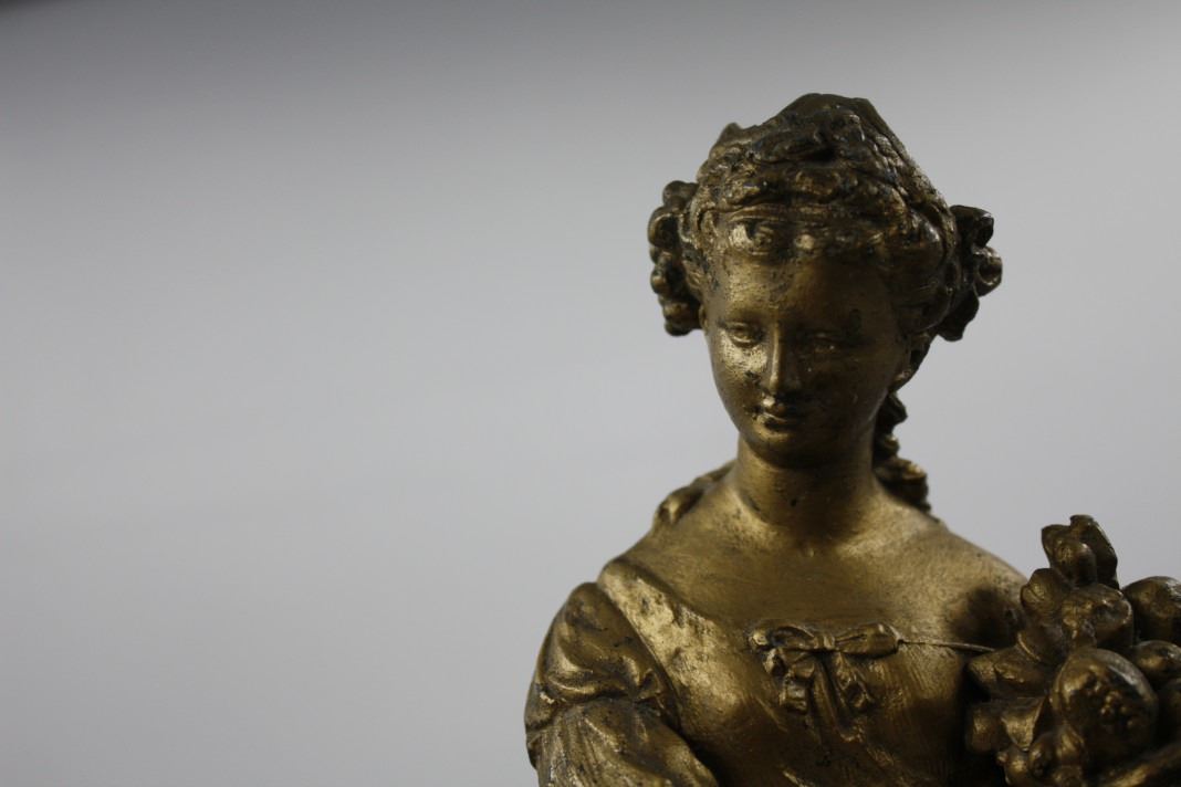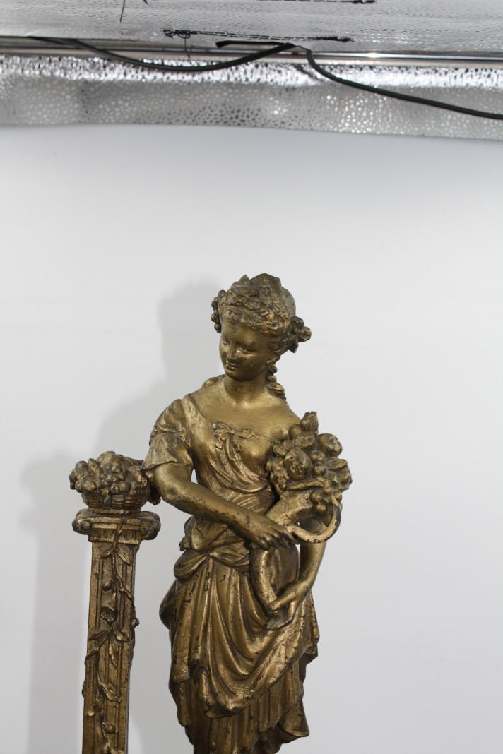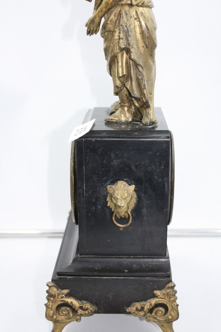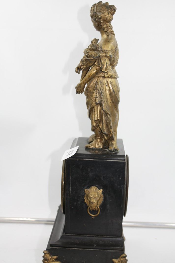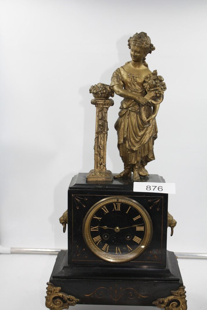 Brass Lady Figurine holding Horn of Plenty with Flowers and Pillar Stand Marble Mantel Clock Lion Heads on the side