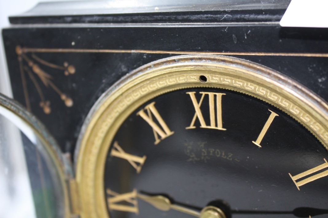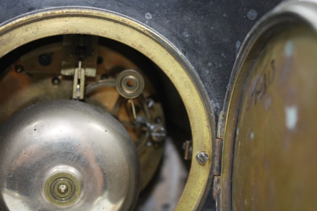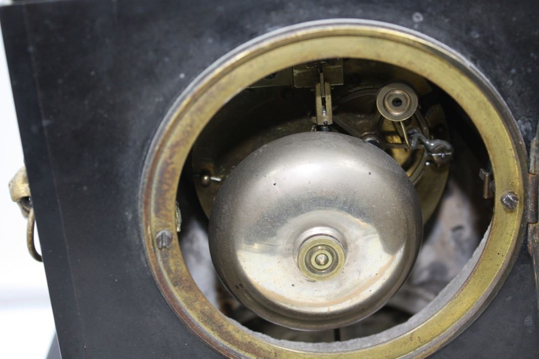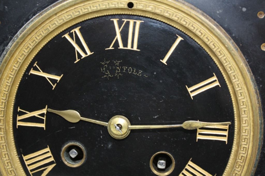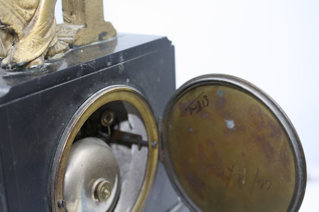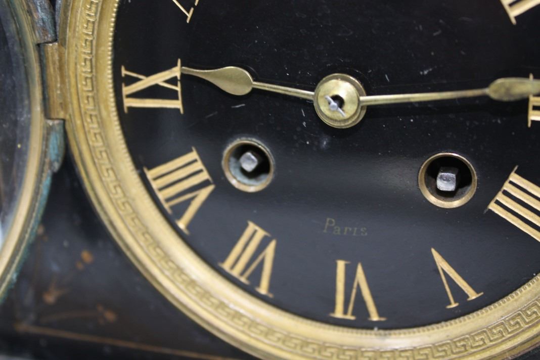 Brass Lady Figurine holding Horn of Plenty with Flowers and Pillar Stand Marble Mantel Clock Lion Heads on the side
