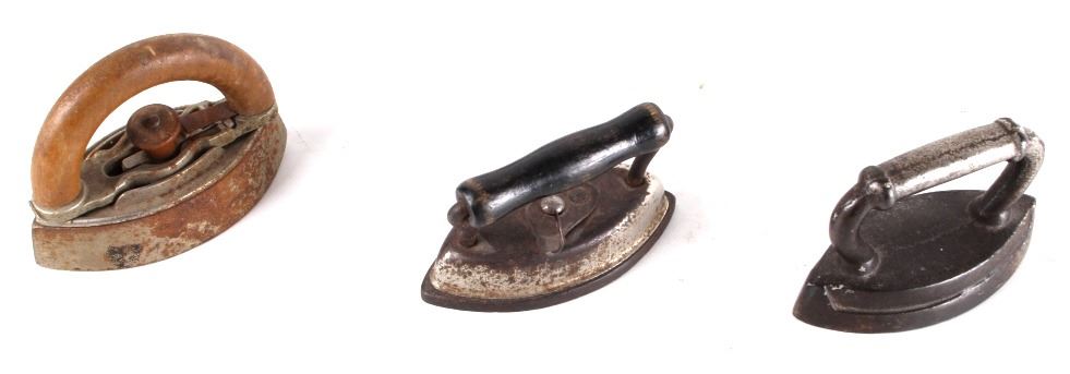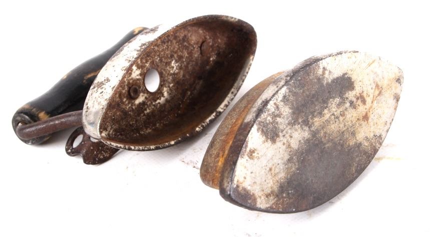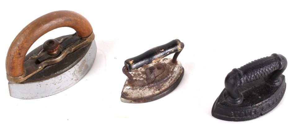 This lot features a antique sad irons. This collection of sad irons is quite the rare sight, each a little more unique then the last. There are six pieces all in good condition for their age. They measures 4 3/4" L x 5 1/4" W x 3 3/4" H, 3 5/8" L x 2 3/4" W x 2 3/4" H, 4" L x 2" W x 2 1/2" H, 3 3/4" L x 2 5/8" W x 2 1/4" H, 3 3/8" L x 2 5/8" W x 2 1/2" H, 3 7/16" L x 2 9/16" W x 2 1/4" H