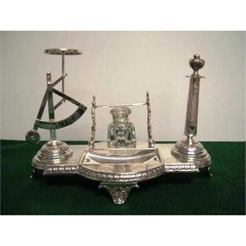 This is a rare and unusually unique & beautiful German silver desk ink set.<p>It has a postage scale, a quill pen holder, a thermometer and a blotter well.<p>In excellent condition, a real showstopper.<p>11" wide 7" deep 8" high<p>German silver mark on bottom WMFM Z/0<p> <p>Shipping and insurance are determined after checkout. <p>