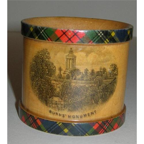 Please see item # 30299 for a matching napkin ring.<p>This is a rare and unusual type of Scottish Mauchline napkin ring combined with tartanware trim top and bottom; better quality than a lot of these Victorian souvenir - type items.<p>Dating to around 1870, the front of this one has a black transfer of Burns Monument, highly collectible.<p>The rear has the following by Robert Burns is printed:<p>He'll hae misfortunes great and sma' But aye a heart aboon them a' He'll a' be be proud o' Robin<p>Superb condition with no loss to tartan, a bright and glossy patina.<p>Measures 1 3/4" thick and a 2" diameter.