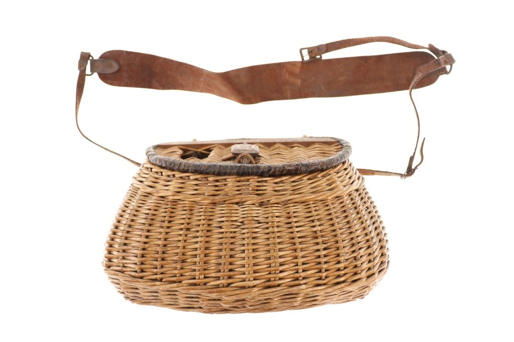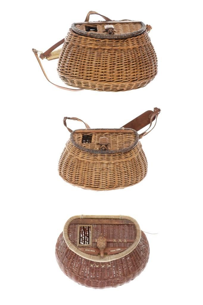 For your consideration are three rare and early antique Turtle Trade Mark woven reed fishing creels. The "Turtle Trade Mark" fishing creels are recognized for their unique turtle-shaped clasps and high-quality wicker construction. These creels, with a golden patina and strengthened rims, were made in the mid-twentieth century, mostly in the northeastern United States. They all show a rounded style and feature the iconic turtle shaped wood clasp on the top of the lids. Two of the creels feature leather shoulder straps with one featuring padding. They show good condition overall with slight wear present from their age and use over the years, but no signs of major damage is noted. They measure from 8 1/4" L x 14 1/2" W x 8" H to 7" L x 13 1/4" W x 7 1/2" H and have a collective weight 3 pounds and 8 ounces.