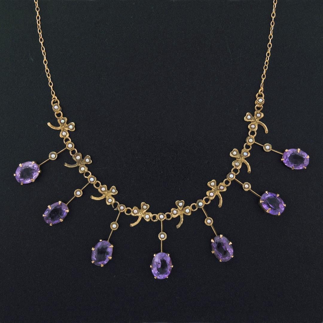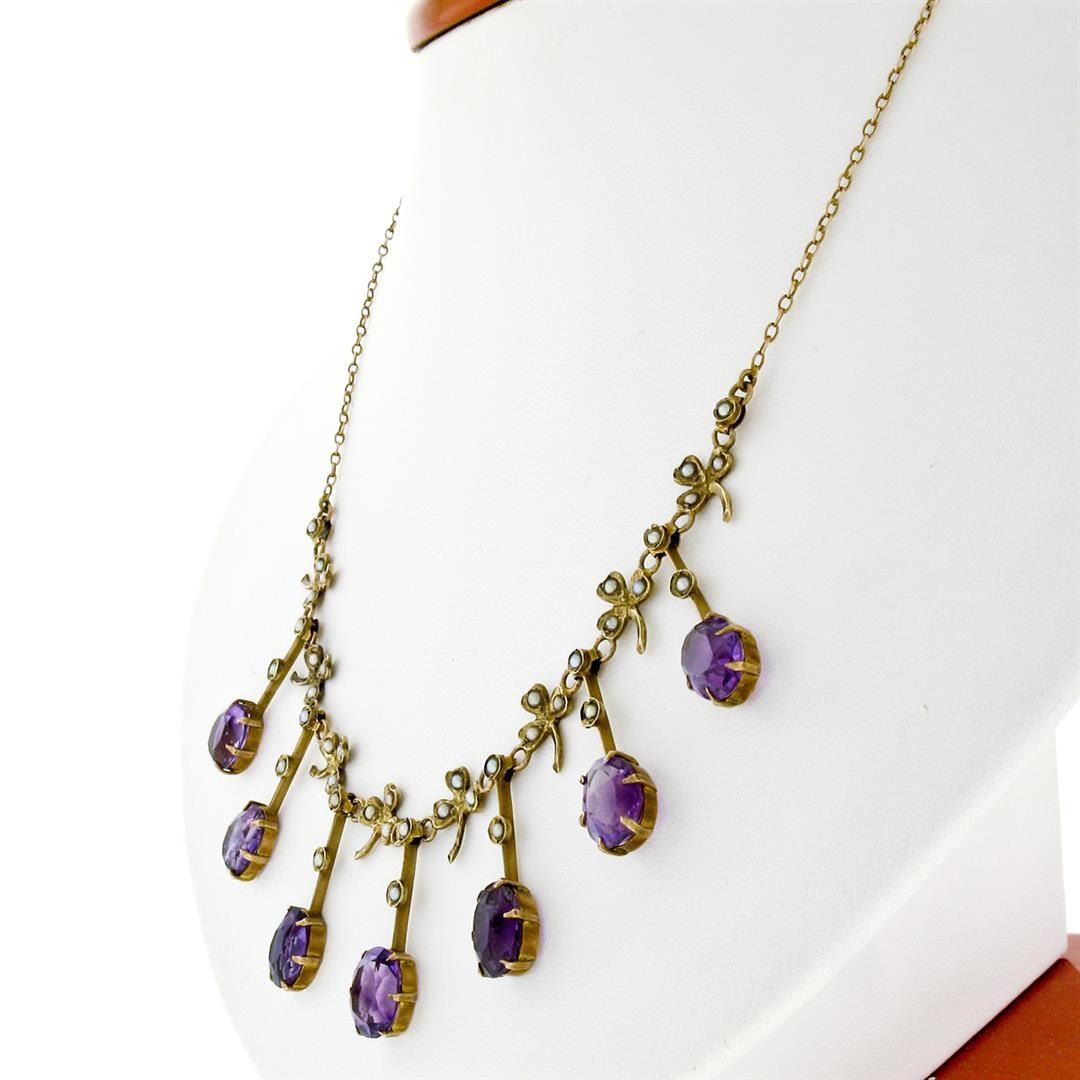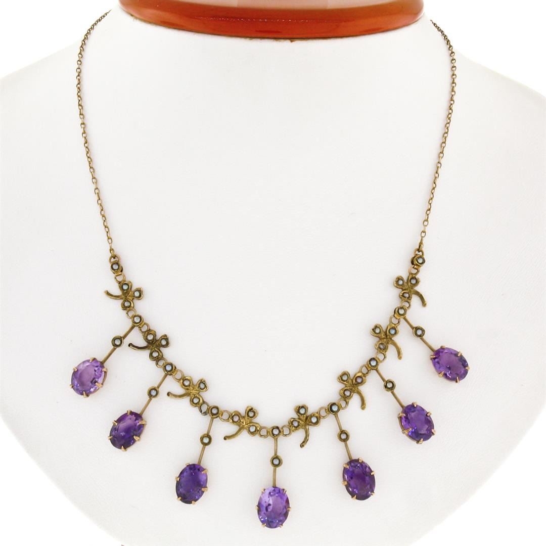 An antique victorian solid 14k yellow gold collier necklace, with 7 oval cut natural amethyst (9.0x7.0mm- 14.0ctw), and 40 round shape natural seed pearls (1.55mm ). 18 inch cable link chain, 9.91 grams total weight, pendant measures 22.50x85.0mm.